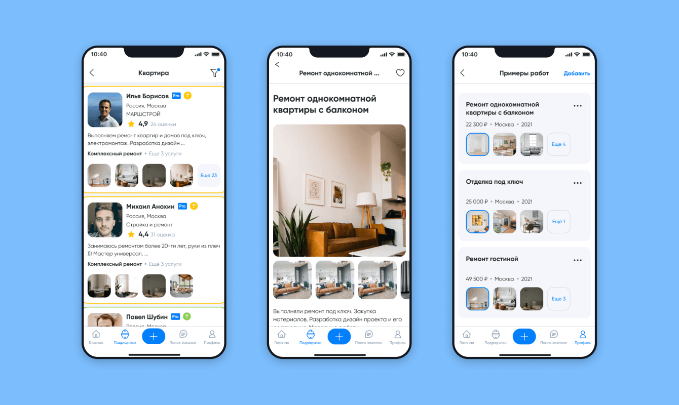 - Пользователь размещает на платформе заказ, на который откликаются подрядчики, готовые выполнить работу.