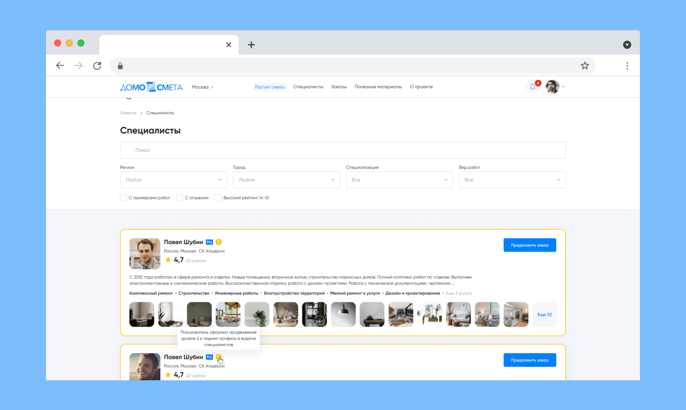 Для упрощения подбора исполнителей, разработана система рейтингов и отзывов.