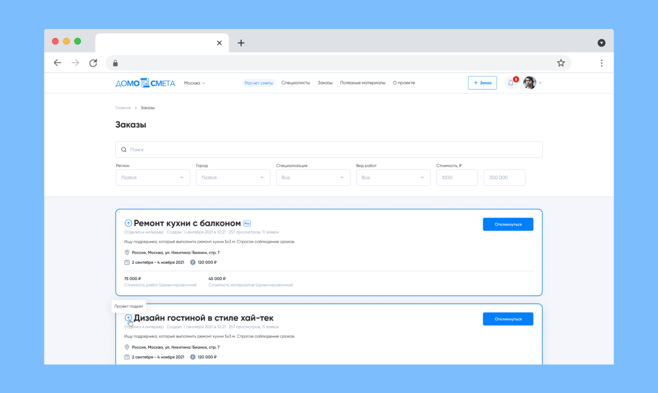 - Пользователь размещает на платформе заказ, на который откликаются подрядчики, готовые выполнить работу.