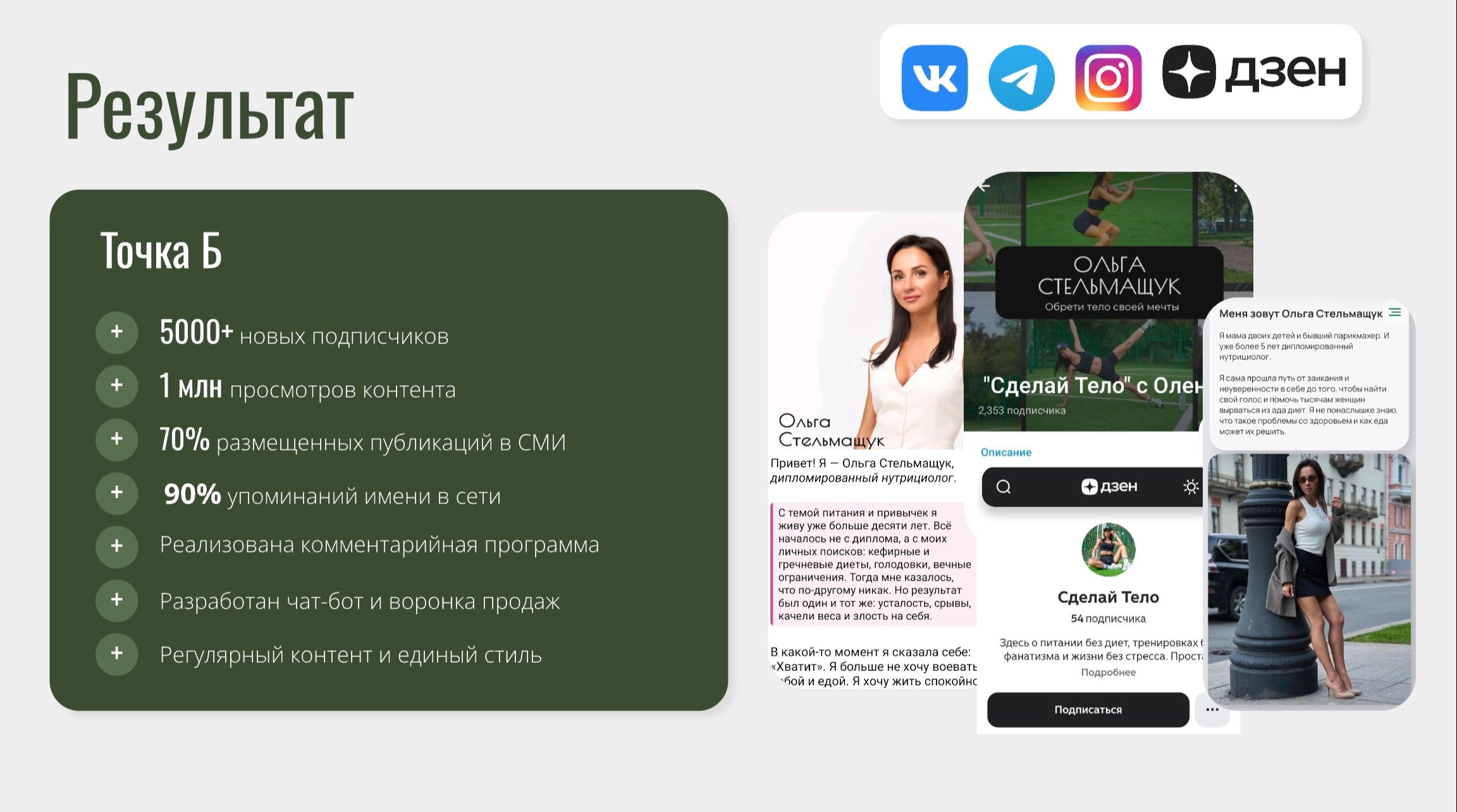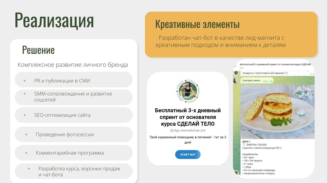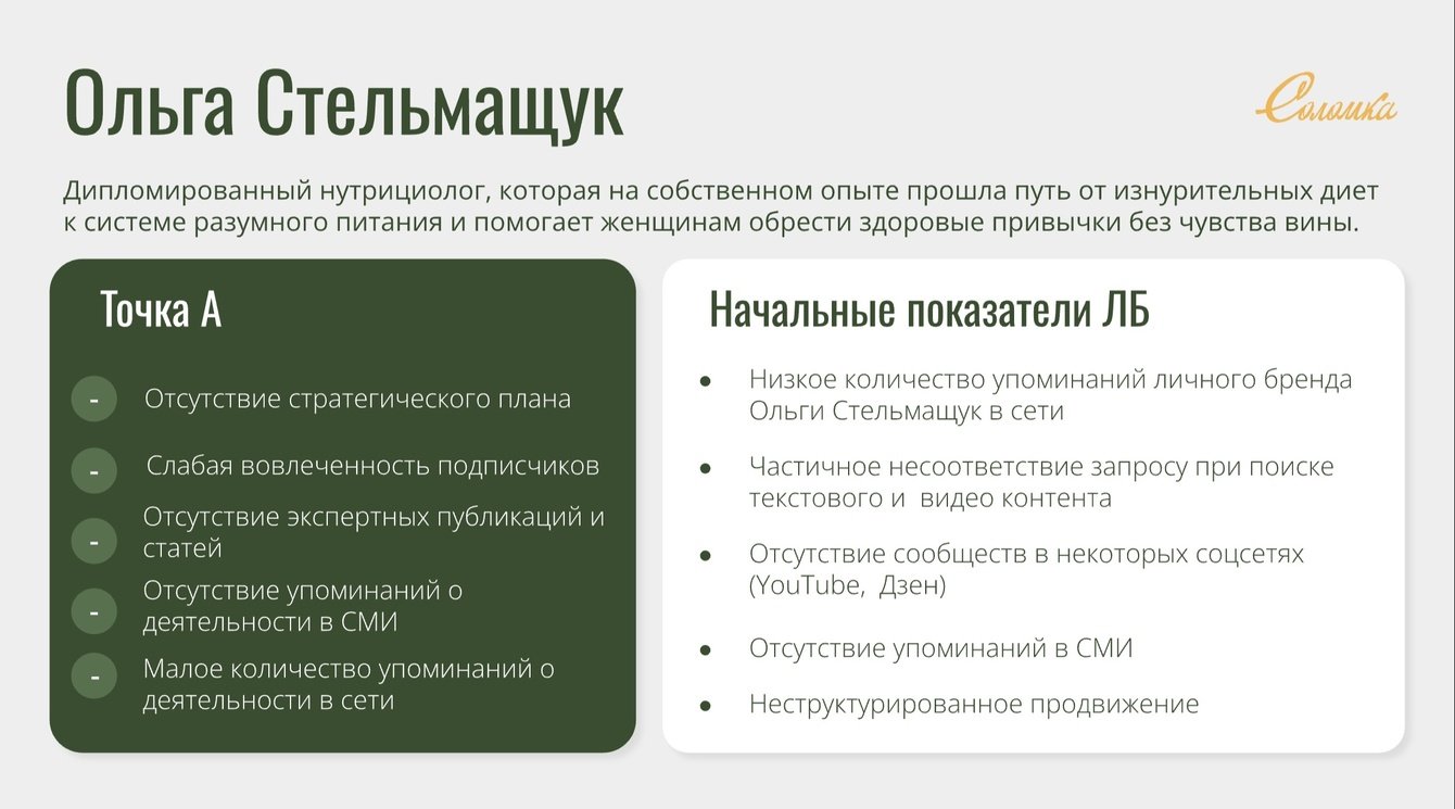 Ольга обратилась с запросом использовать уже имеющийся уровень влияния для системного развития личного бренда с целью укрепления экспертного статуса в области диетологии и нутрициологии, формирования доверительного сообщества и последующей монетизации через запуск авторского курса.