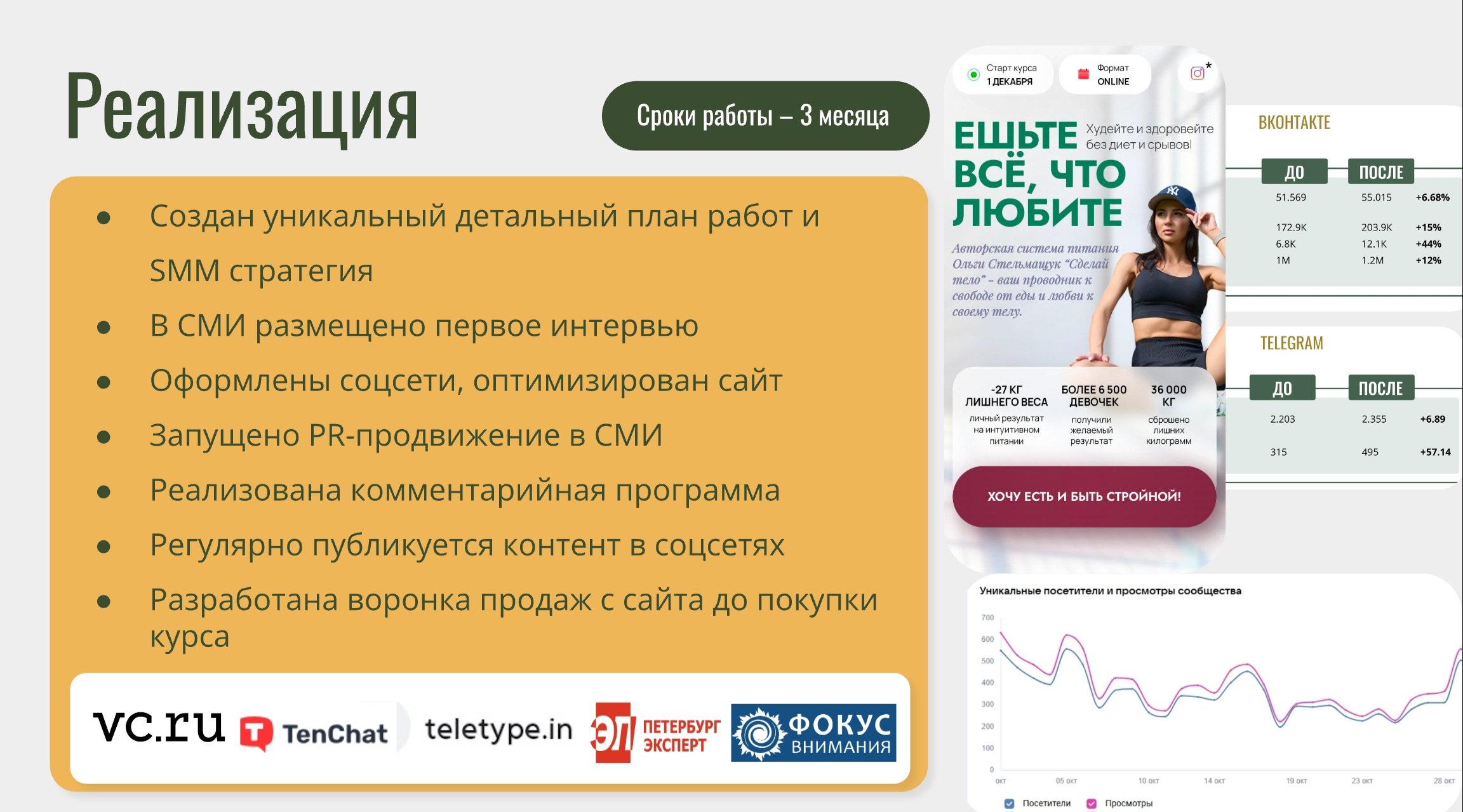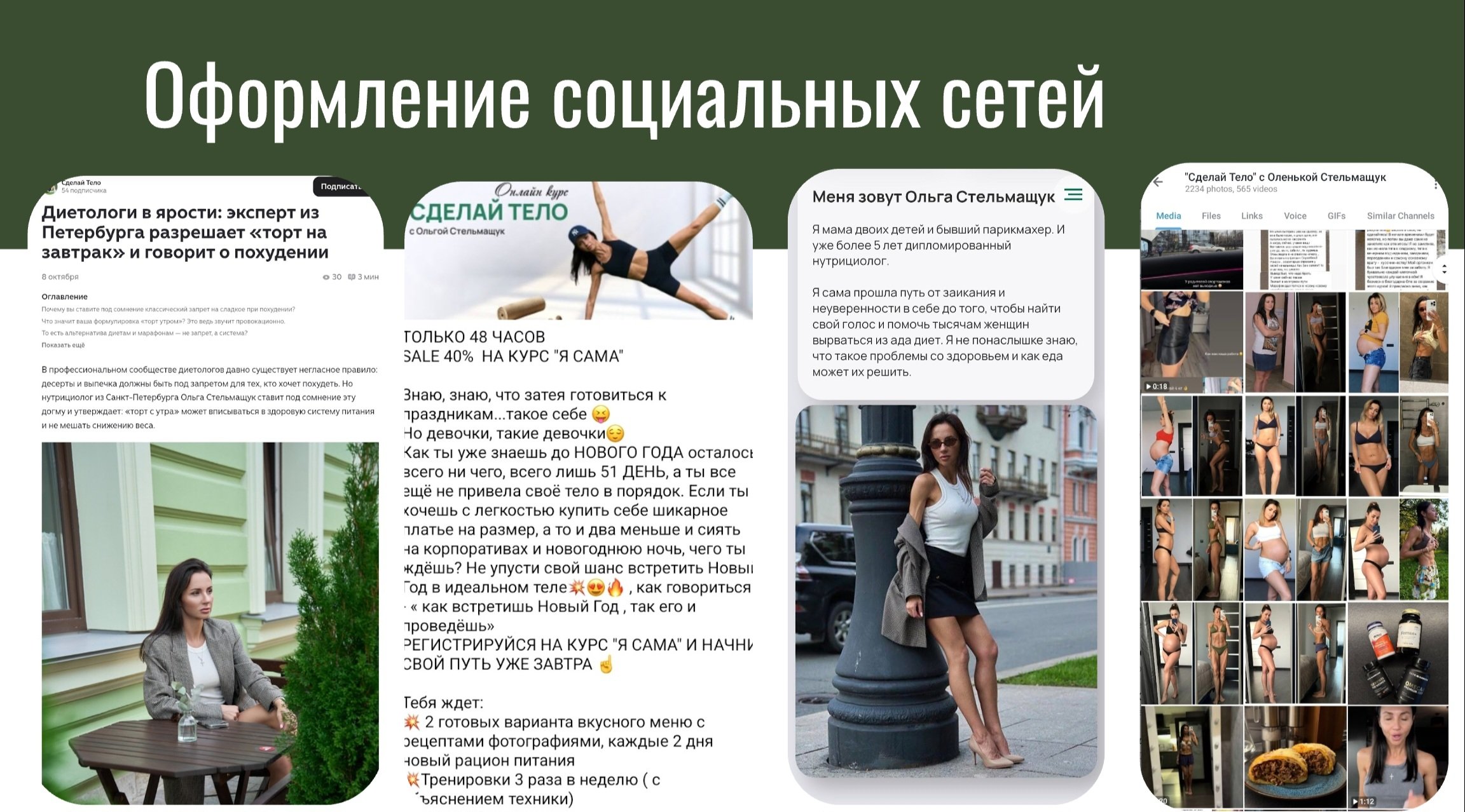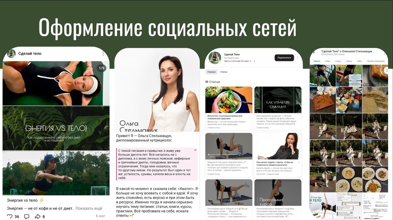 Ольга обратилась с запросом использовать уже имеющийся уровень влияния для системного развития личного бренда с целью укрепления экспертного статуса в области диетологии и нутрициологии, формирования доверительного сообщества и последующей монетизации через запуск авторского курса.