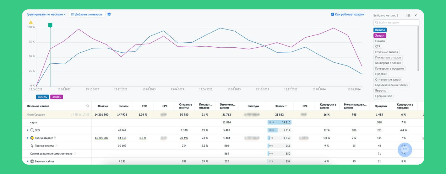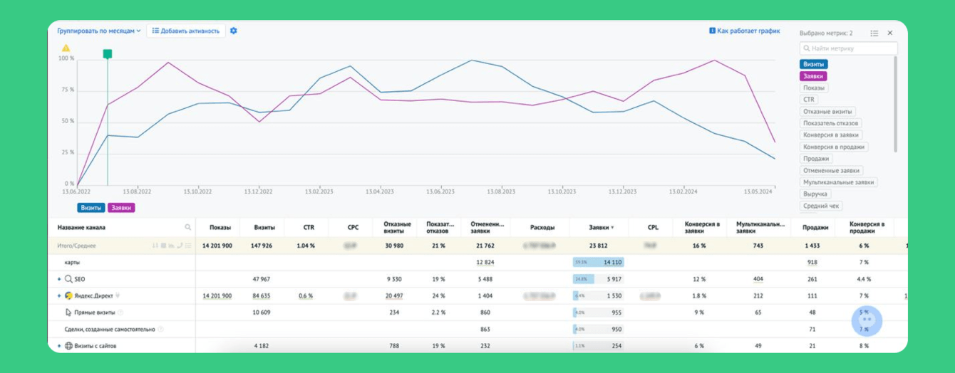 Система Roistat была настроена, были настроены интеграции с CRM-системой, коллтрекингом и емейлтрекингом внутри Roistat для отслеживания источников по звонкам и е-мейлам, был настроен онлайн-чат на сайте от Callibri, настроены все связки рекламных каналов, сайта и прочих систем между собой. Теперь для просмотра и анализа всех данных было достаточно открыть окно браузера и в режиме онлайн увидеть текущую ситуацию по заявкам и продажам.