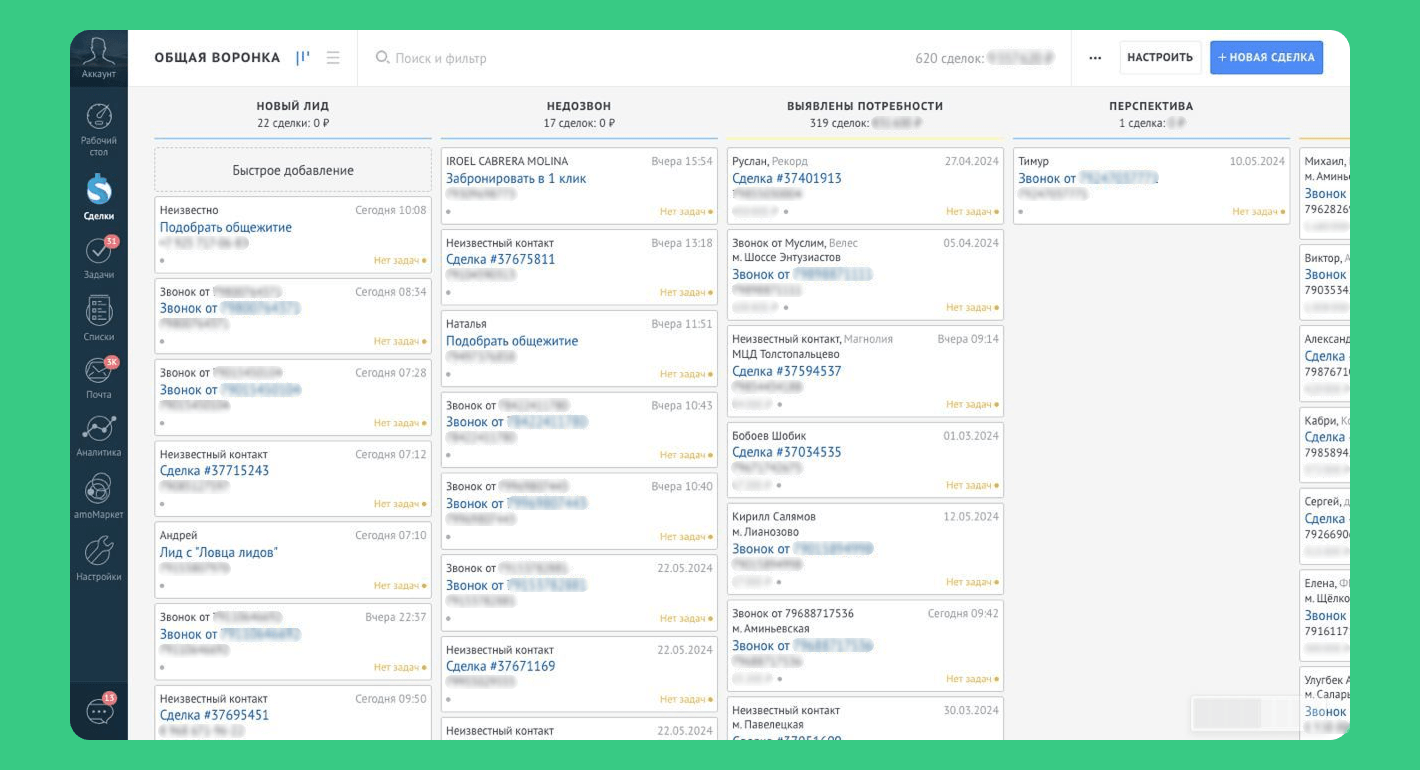 Ранее клиент не использовал какую-либо систему ведения сделок и клиентов, от этого была полная неизвестность, о количестве сделок в работе, средних чеках и циклах сделок: это просто-напросто не считалось. Простой вопрос: «какая конверсия из заявки в заселение?», оставался без ответа. Плюс ко всему было сложно оцифровать базу и выстроить по ним системную работу с холодными обзвонами.