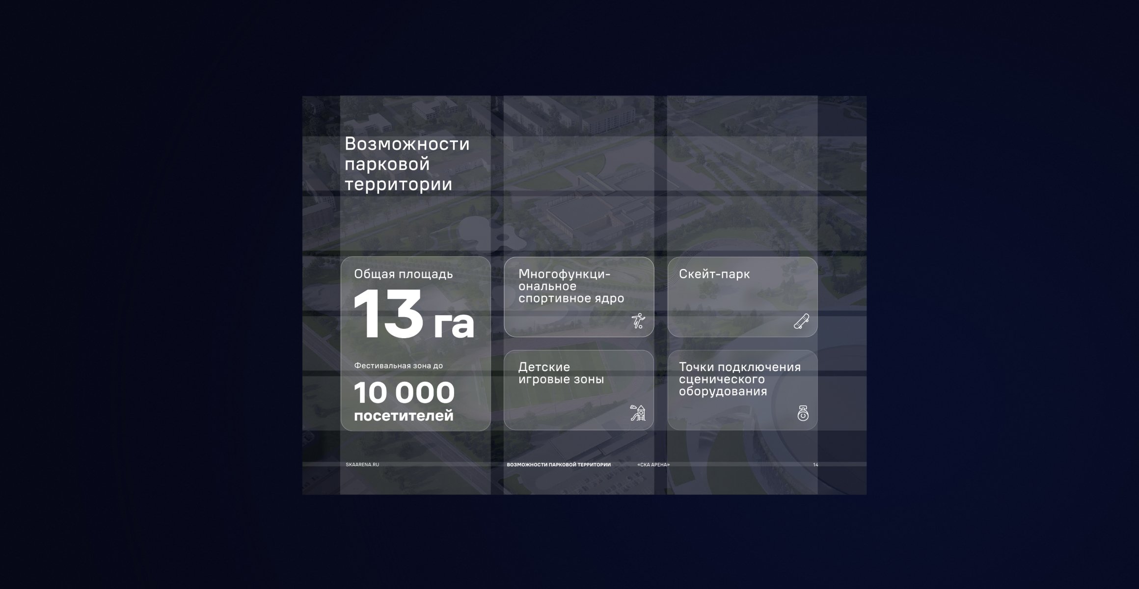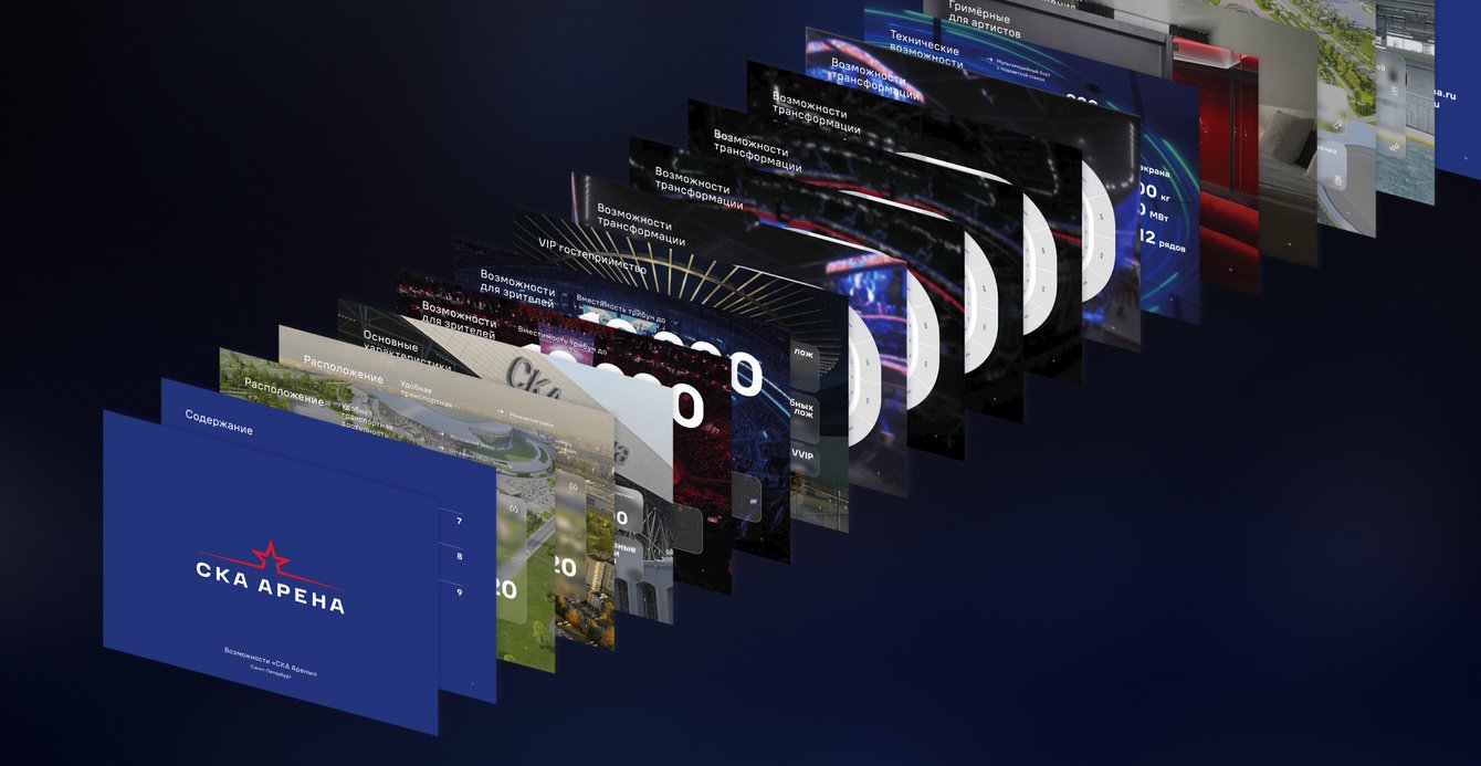 Мы разработали современный технологичный дизайн презентации. Яркие изображения, легкая и понятная инфографика передают принципы СКА Арены в работе с партнёрами: четкость, прозрачность, гибкость и комплексный подход в решении задач по проведению мероприятий любого формата. Дизайн отражает динамичный и прогрессивный характер бренда, инновационный взгляд на индустрию событийного маркетинга.