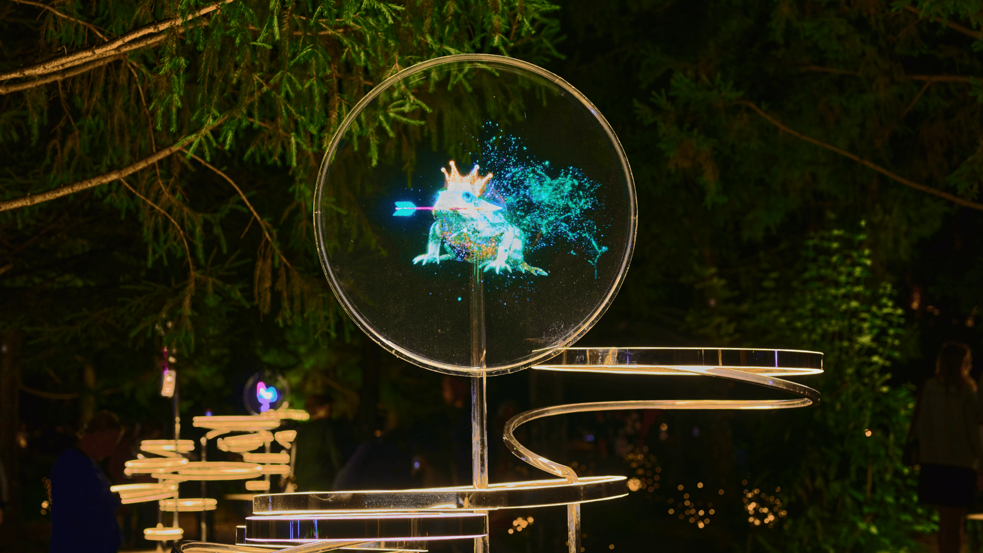 Для проекта были созданы семь арт-инсталляций из зеркальной полированной стали с радиусными формами, дополненных элементами неоновой подсветки и мультимедийными голографическими вентиляторами. На них были изображены сказочные герои: Кот ученый, Царевна-лягушка, Финист – Ясный сокол, Царевна-лебедь, Жар-птица и другие. Визуальные эффекты были созданы в программе Houdini, и каждый объект имел свое аудио сопровождение.