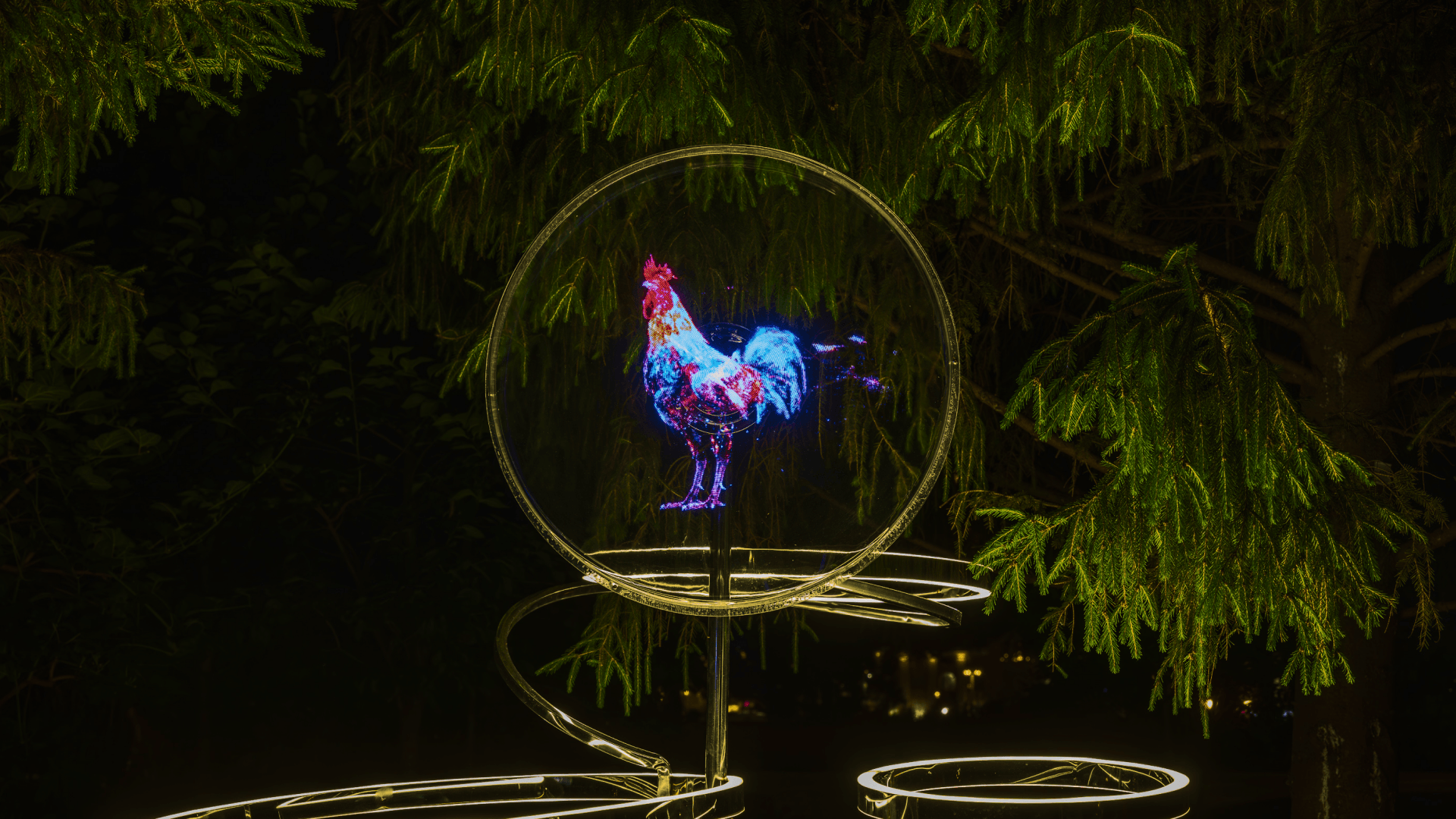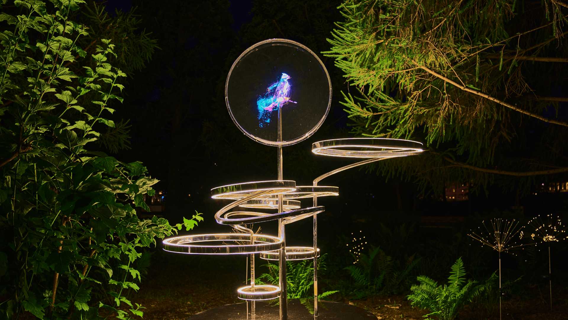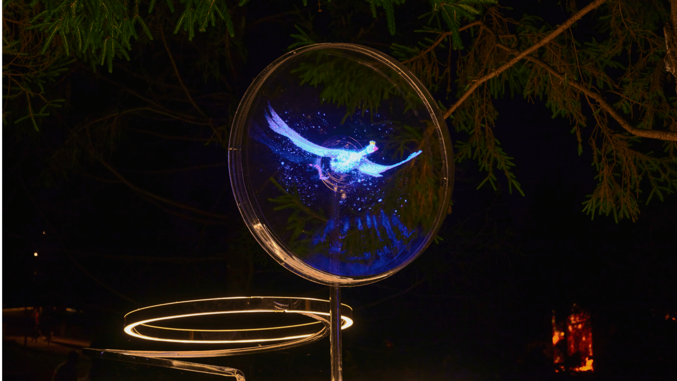 Благодаря эффекту отражения зеркальных поверхностей, инсталляция органично встроилась в окружающую среду, а персонажи сказок будто возникали из воздуха и парили перед зрителем. Свет и звук помогали персонажам фольклора “ожить” в темное время суток, перенося посетителей парка Зарядье в сказочный лес.