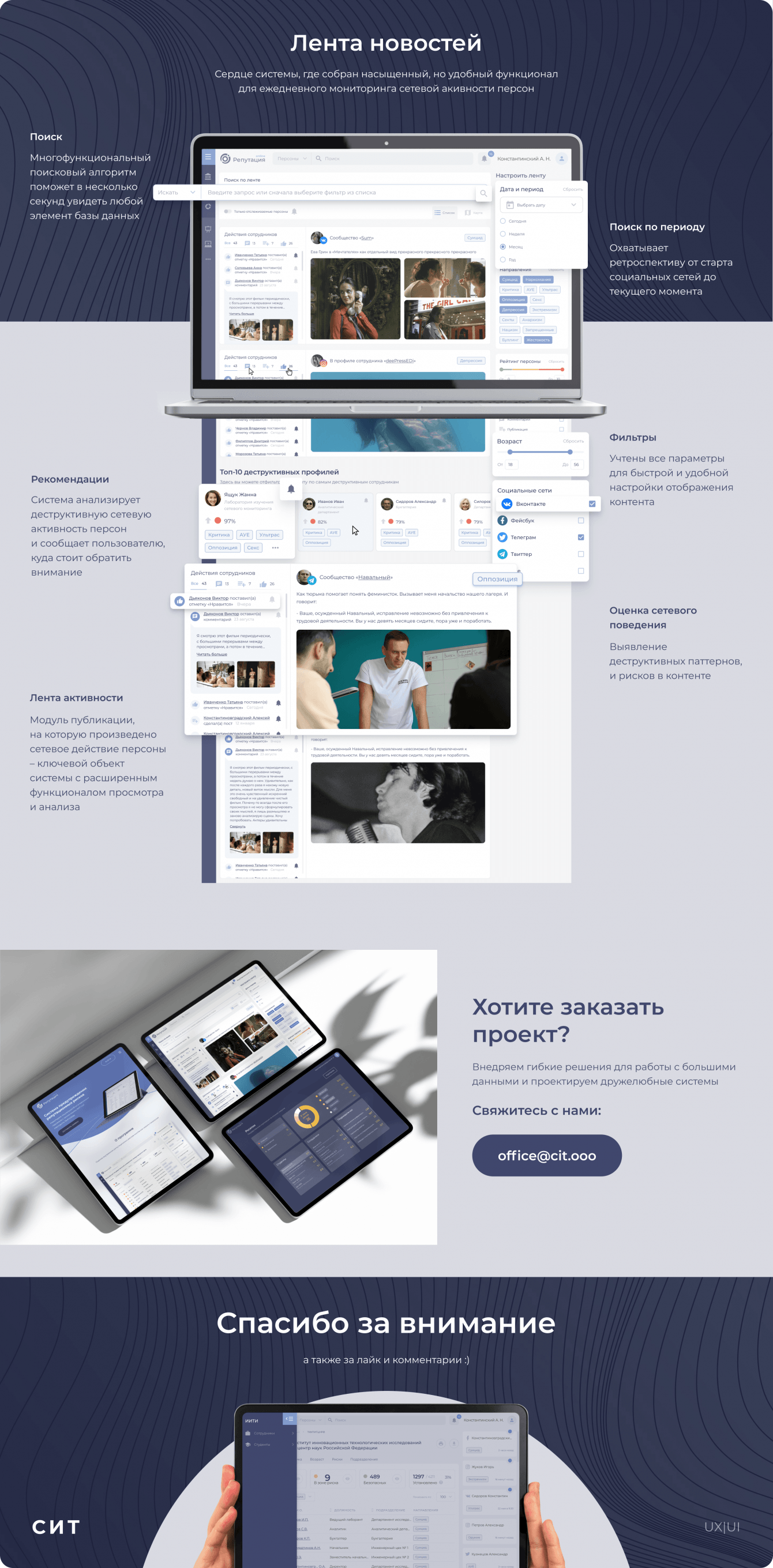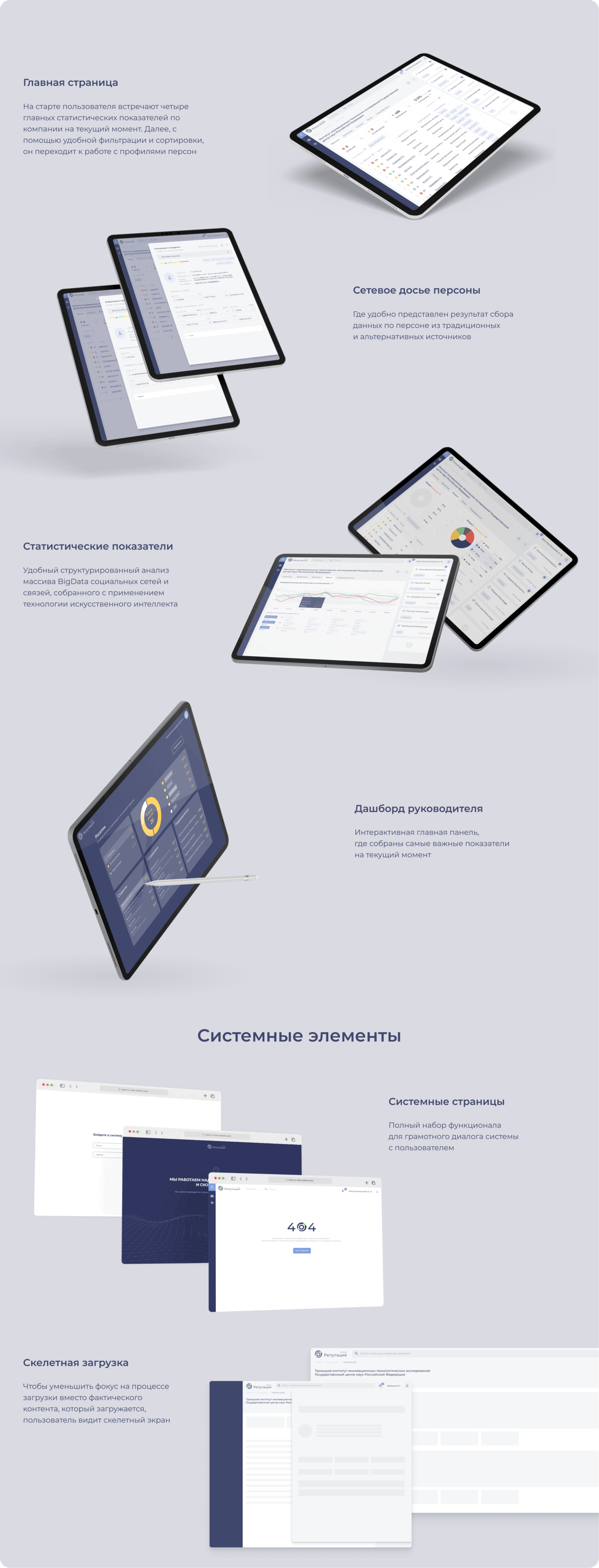 Несмотря на сжатость сроков разработки такого масштабного и сложного продукта, удалось применить все современные методики и этапы UX/UI-проектирования интерфейсов, получив полностью функциональный макет системы