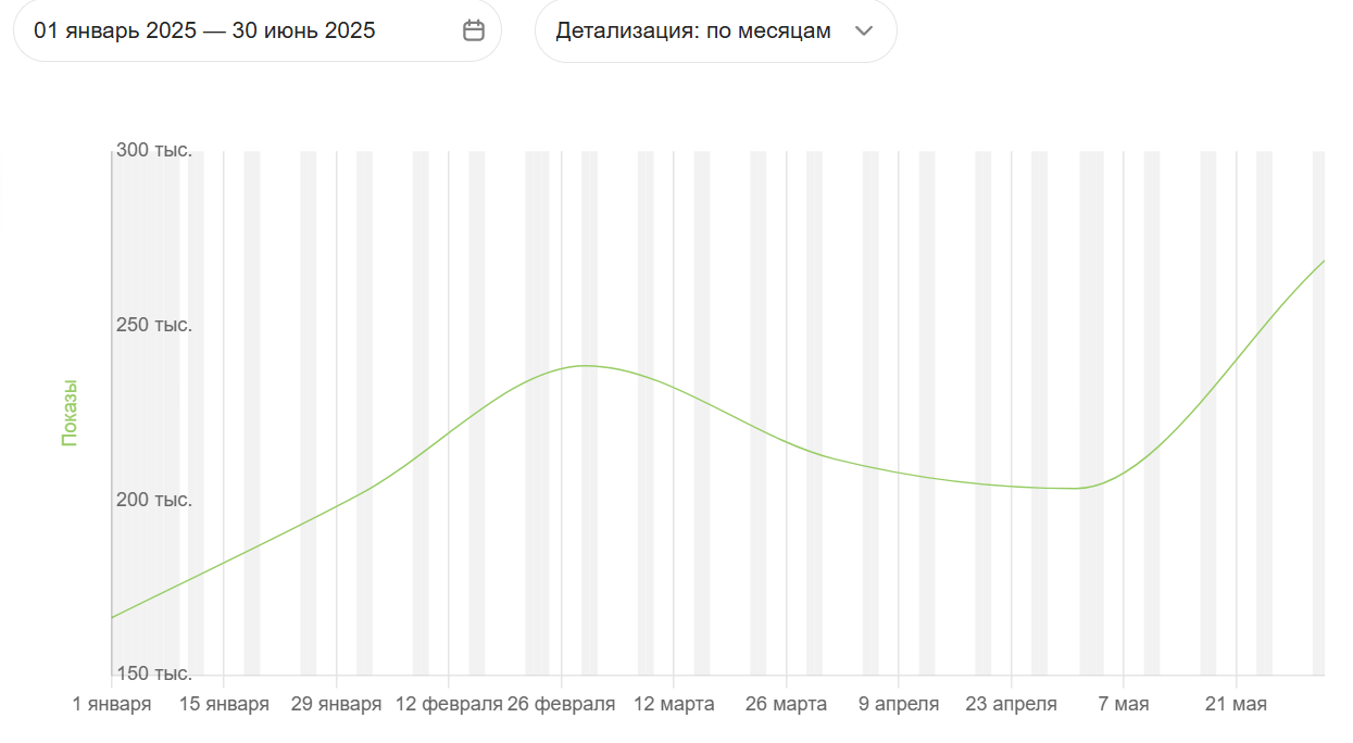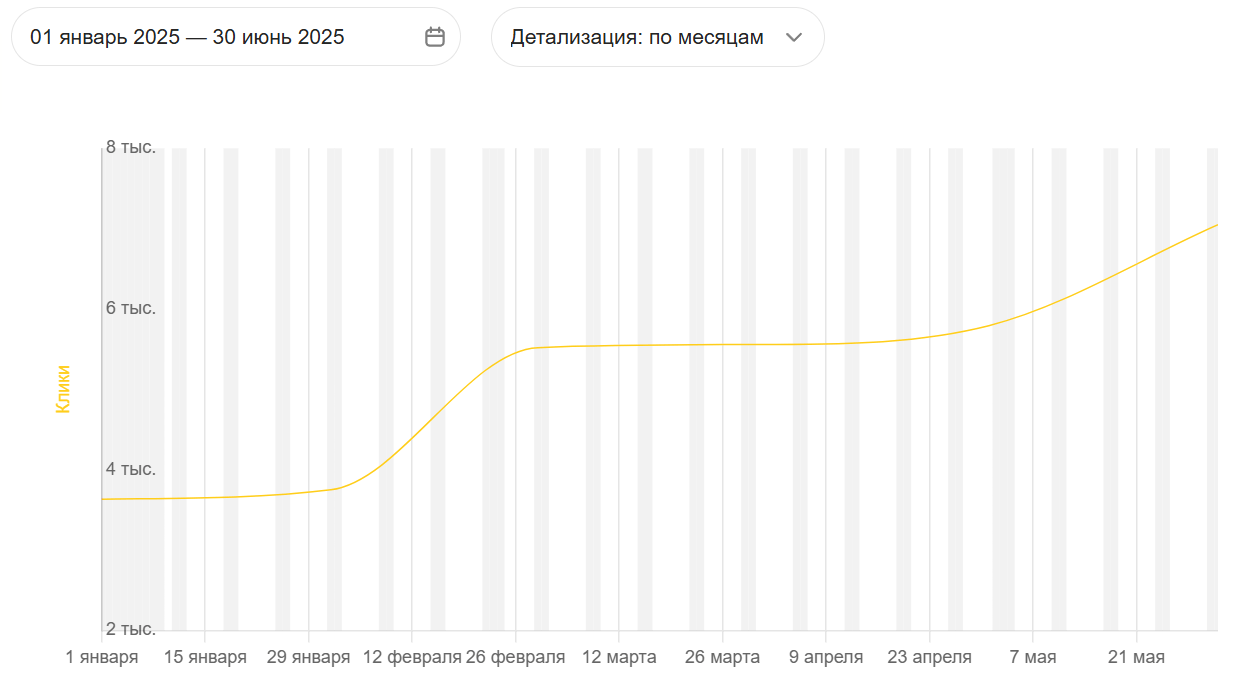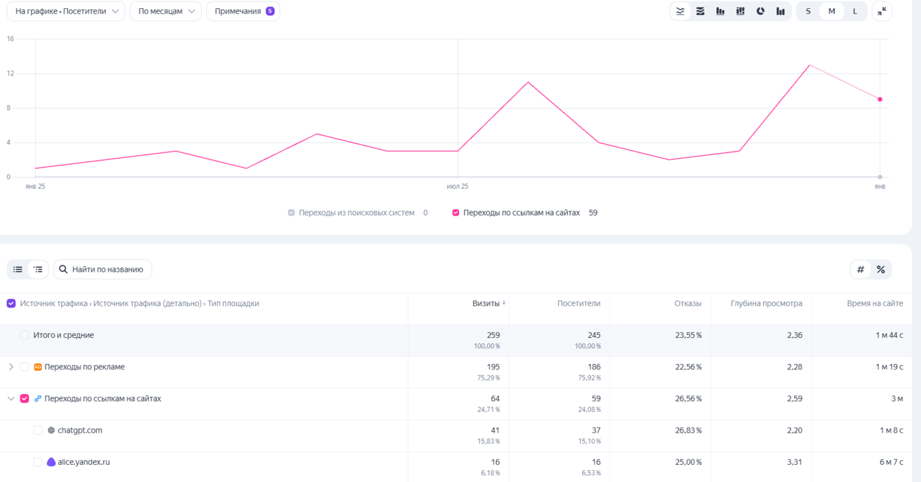 Если в начале работы сайт в AI-ответах практически не появлялся, то по итогам года динамика стала положительной и продолжает расти каждый месяц.