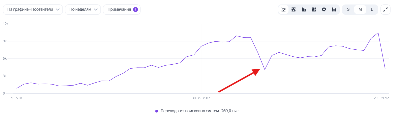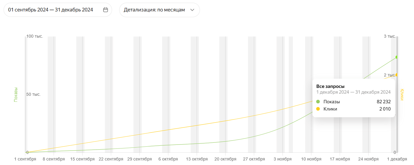 При запуске в конце августа трафик резко упал: разработчик не убрал служебную метку noindex, и страницы исчезли из выдачи. Как только обнаружили — оперативно исправили. К ноябрю трафик не просто вернулся на прежний уровень, но превысил его.