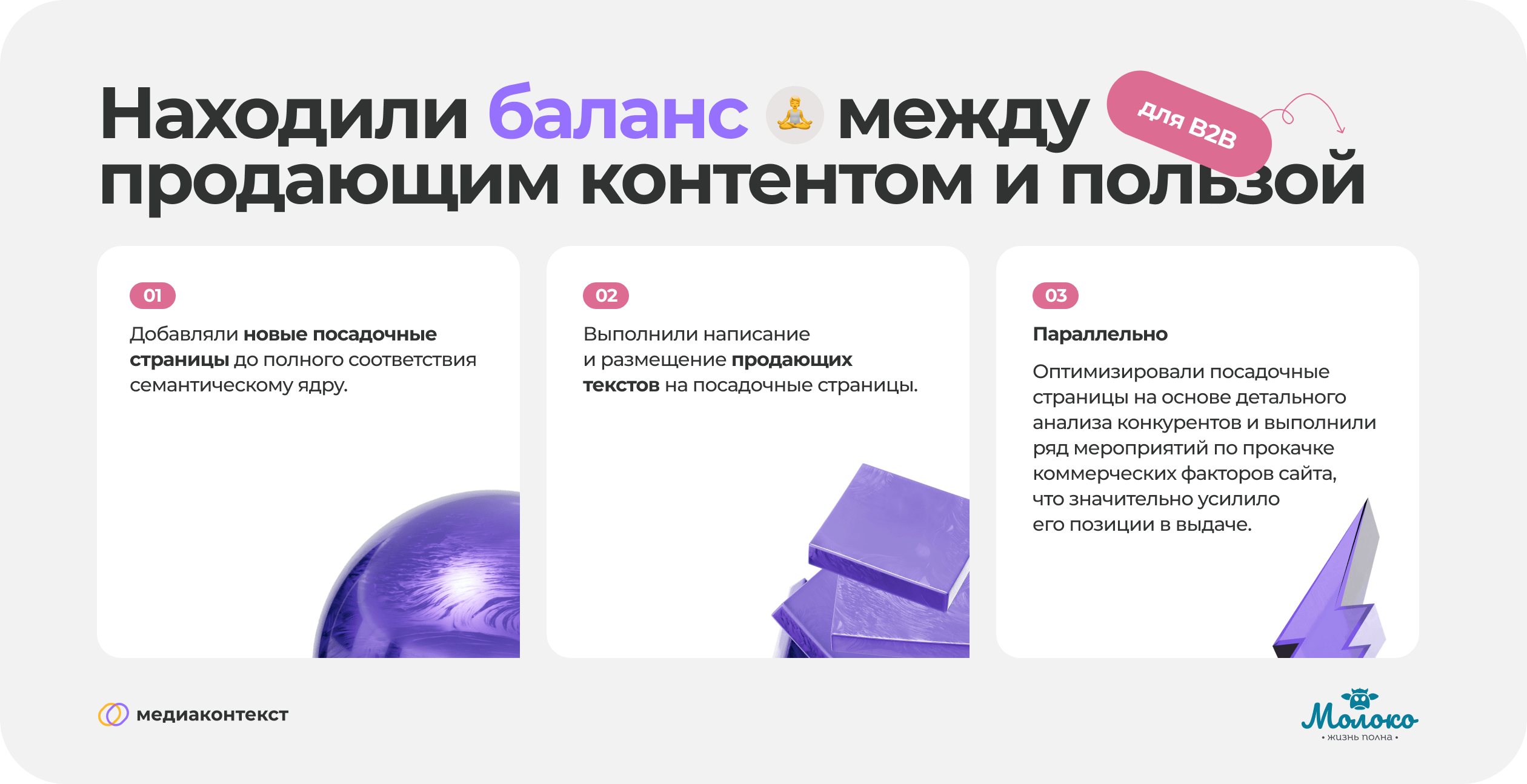 Когда структура была готова, мы приступили к наполнению и расширению сайта. В процессе работы столкнулись с необходимостью найти баланс между продающим контентом и полезной информацией для B2B-клиентов: