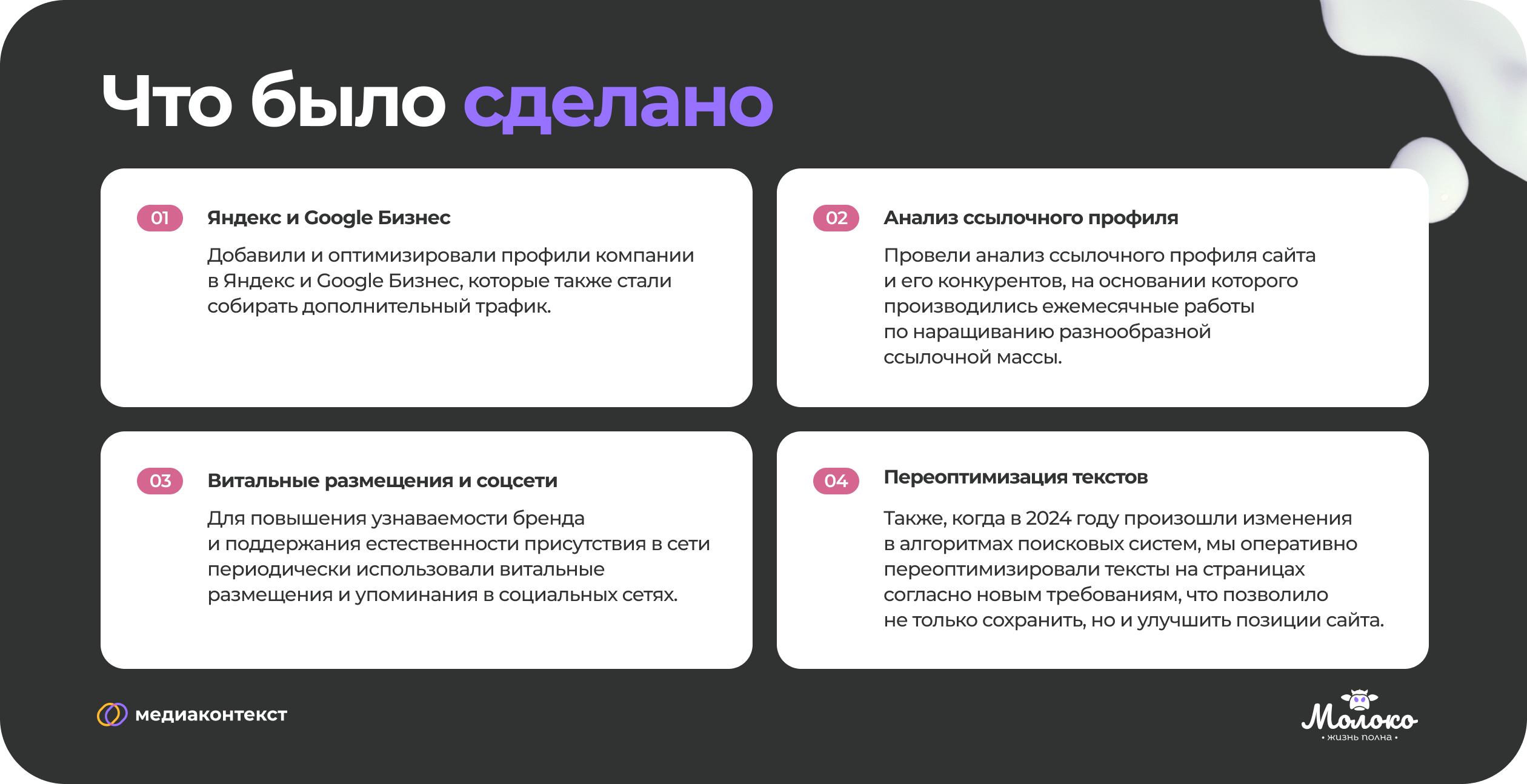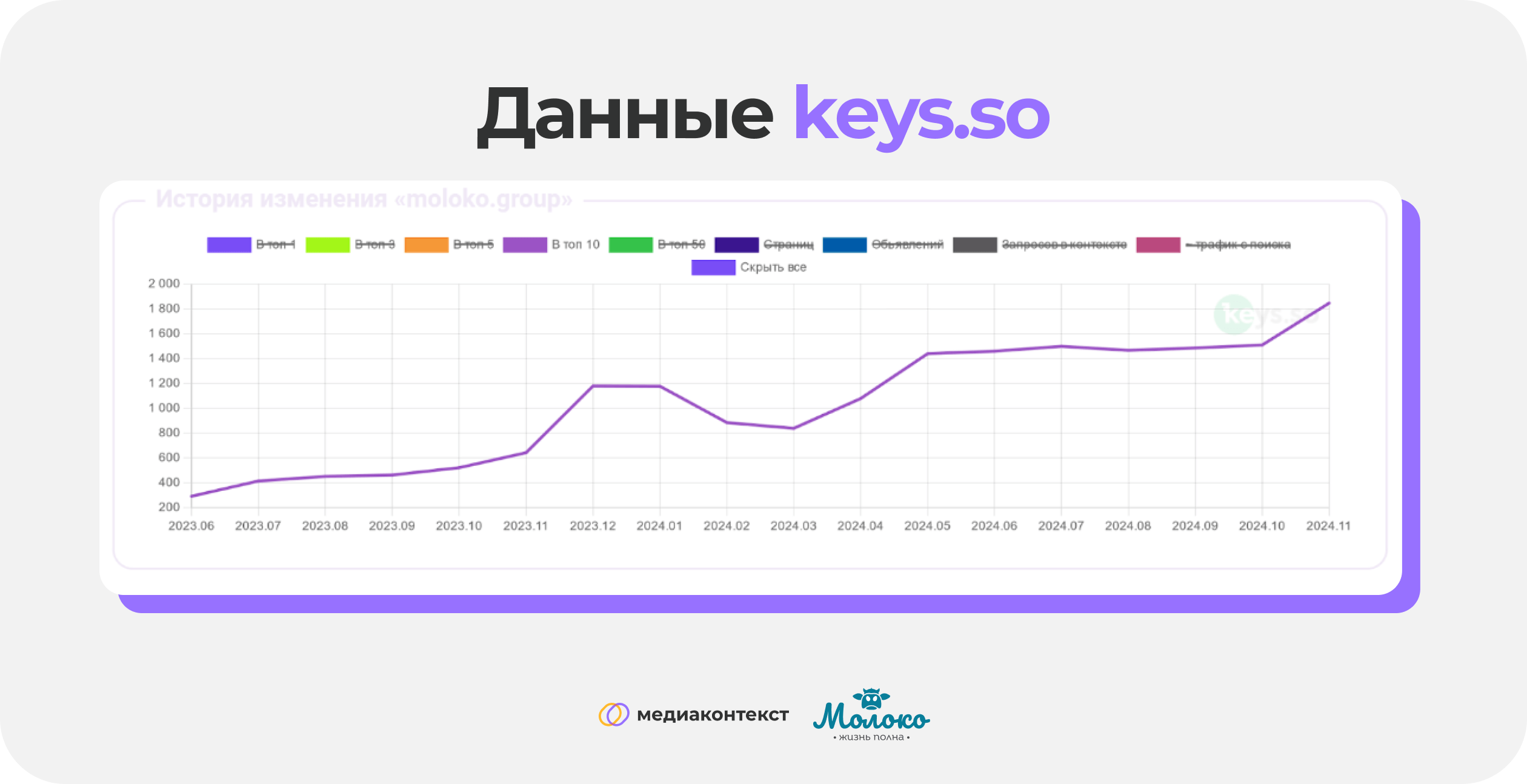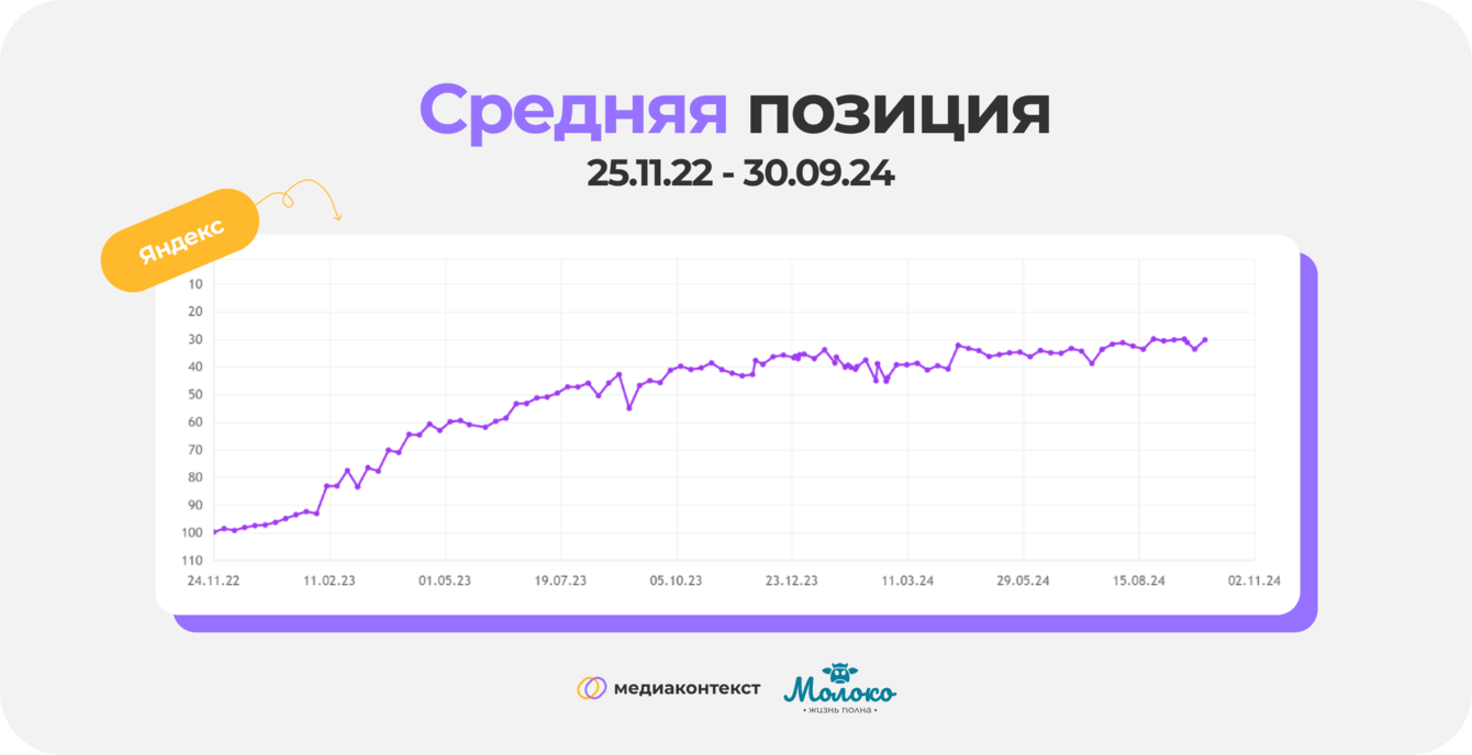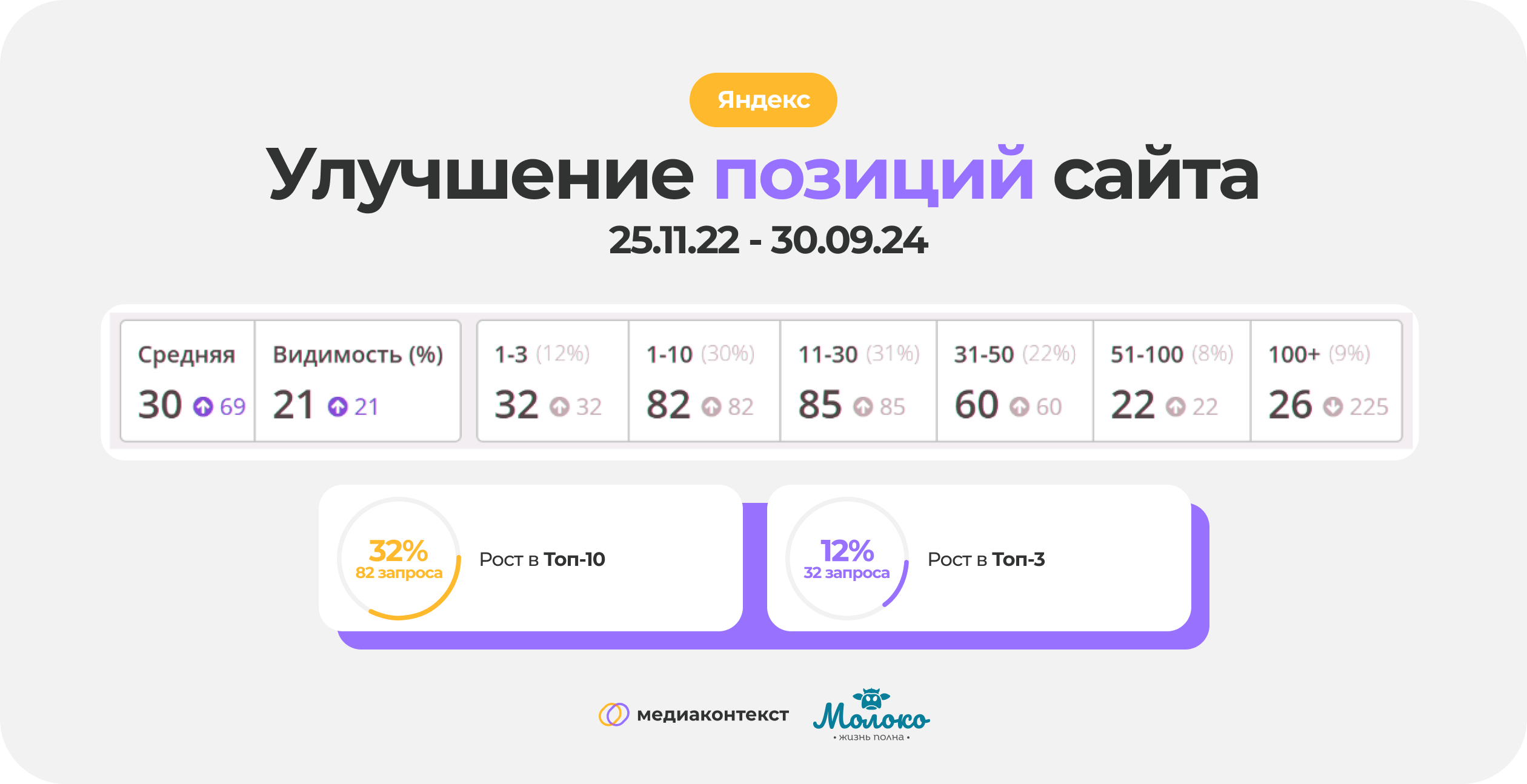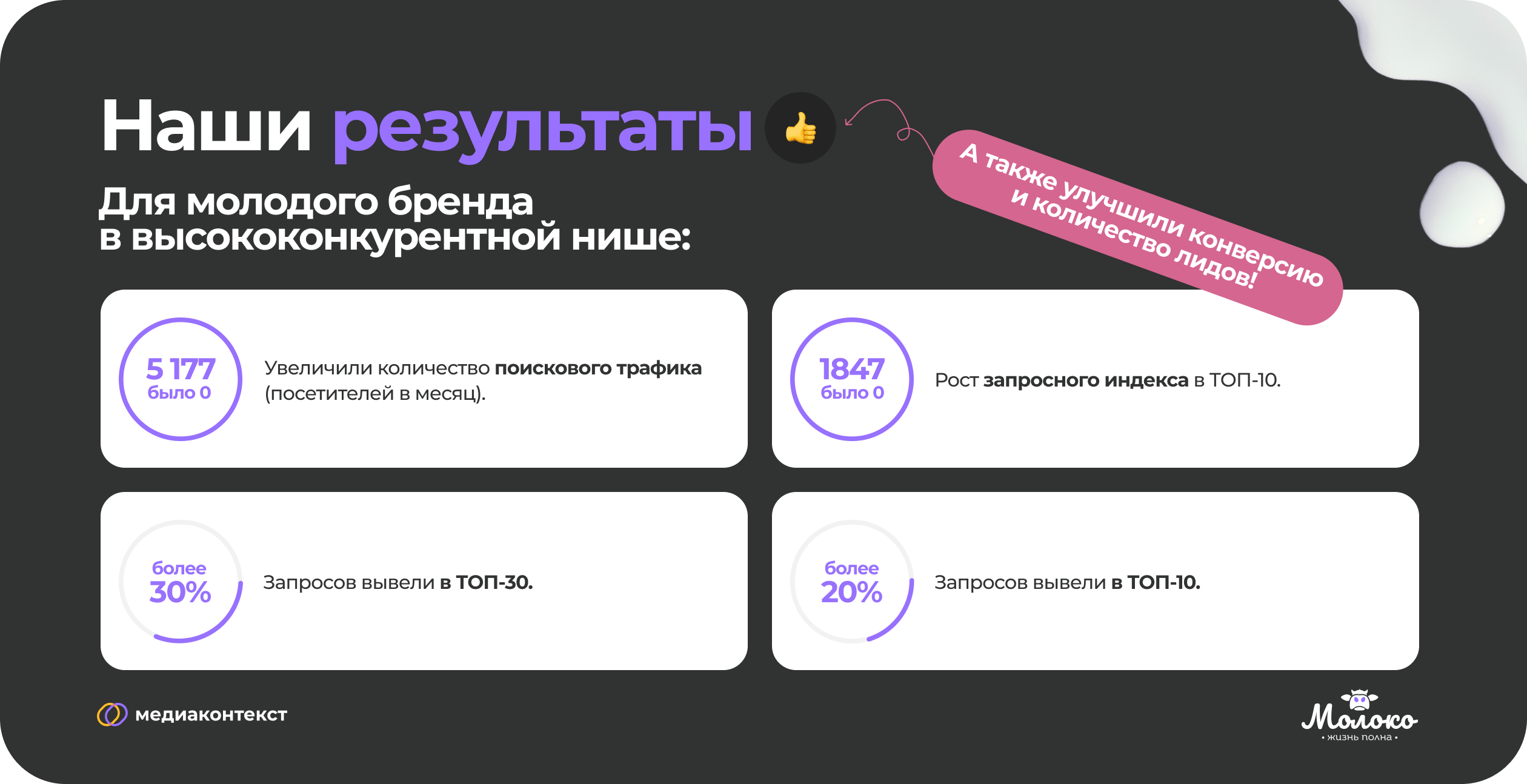 Мы получили в продвижение сайт, который находился в невыгодном положении на старте. Молодой домен без истории и авторитета в сфере, где доминируют гиганты молочной индустрии и крупные агрегаторы и маркетплейсы с многолетней историей. Компания Молоко Групп – производитель качественной молочной продукции – нуждалась в комплексной SEO-стратегии для привлечения B2B-клиентов в высококонкурентной нише.