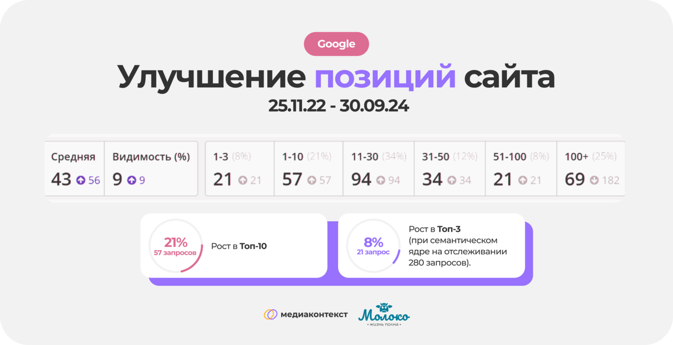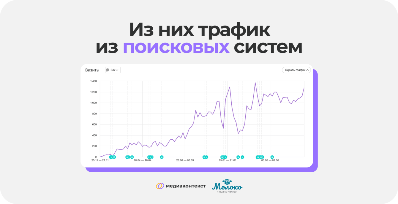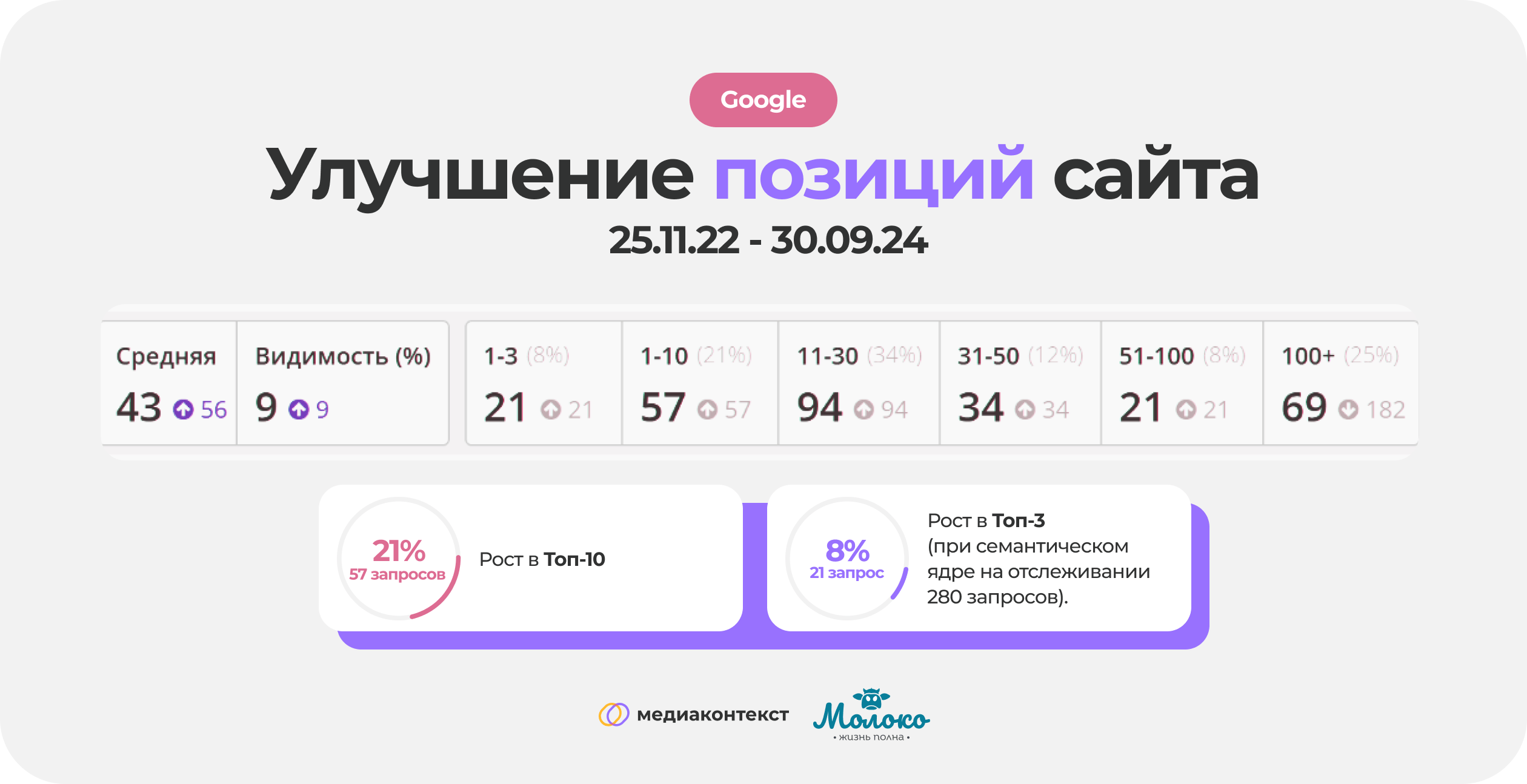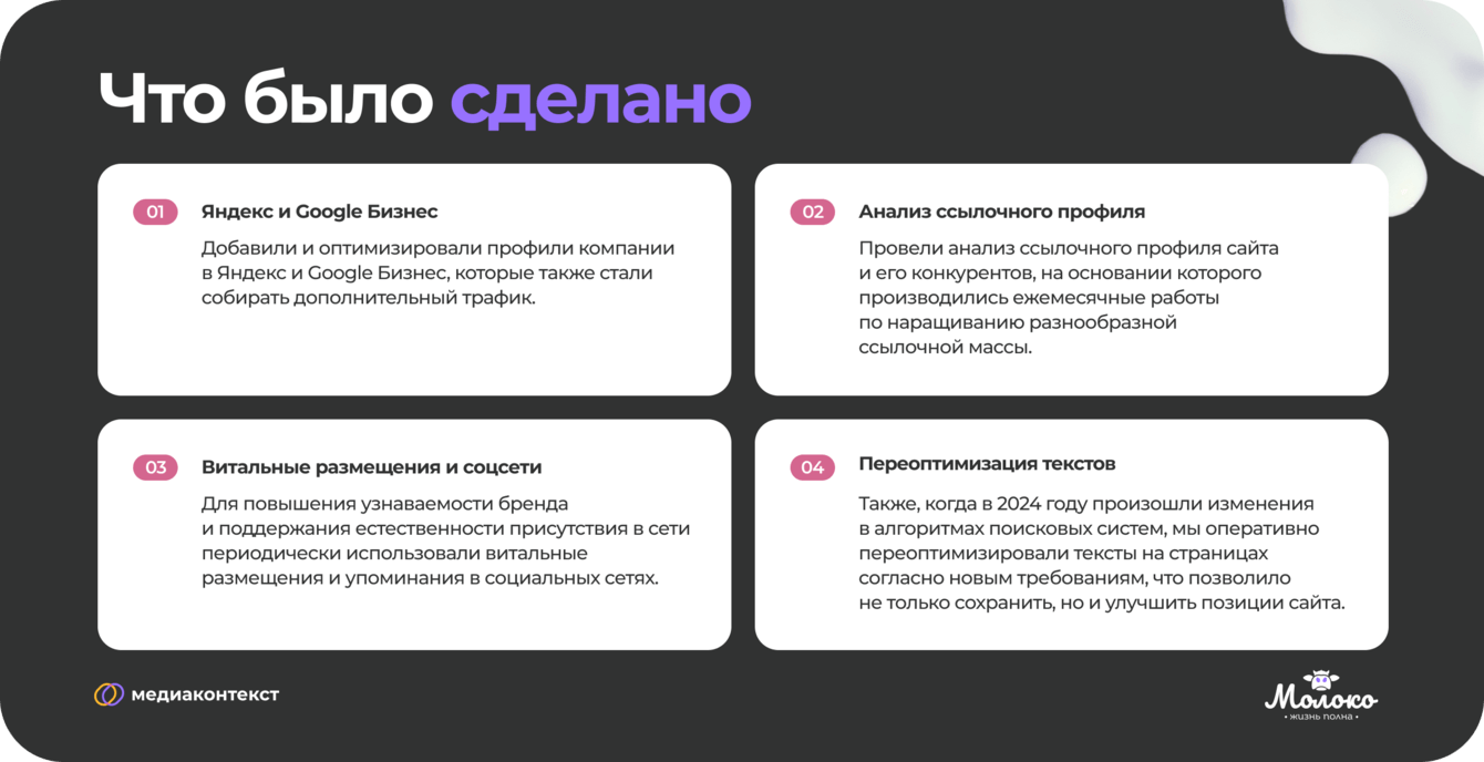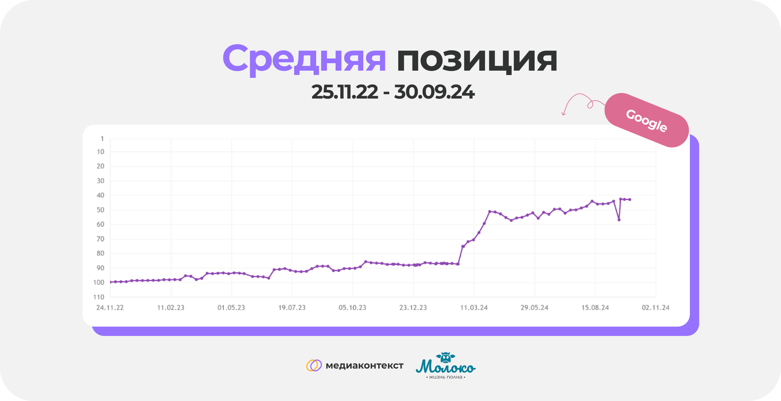 Мы получили в продвижение сайт, который находился в невыгодном положении на старте. Молодой домен без истории и авторитета в сфере, где доминируют гиганты молочной индустрии и крупные агрегаторы и маркетплейсы с многолетней историей. Компания Молоко Групп – производитель качественной молочной продукции – нуждалась в комплексной SEO-стратегии для привлечения B2B-клиентов в высококонкурентной нише.