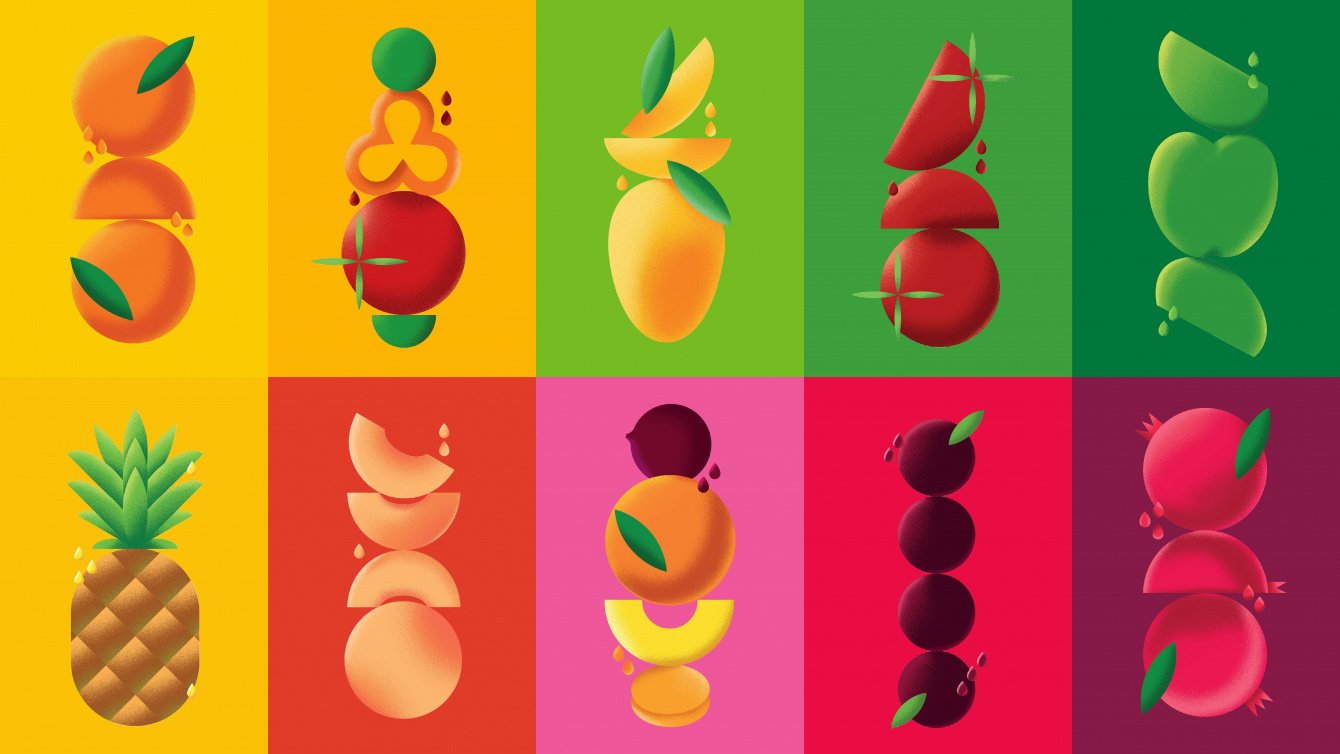 Яркие цвета фона и геометрические абстрактные фигуры фруктов передают гармоничный и насыщенный вкус напитков. Каждая иллюстрация совместно с фоном и шрифтовой частью формирует атмосферное восприятие у потребителя.