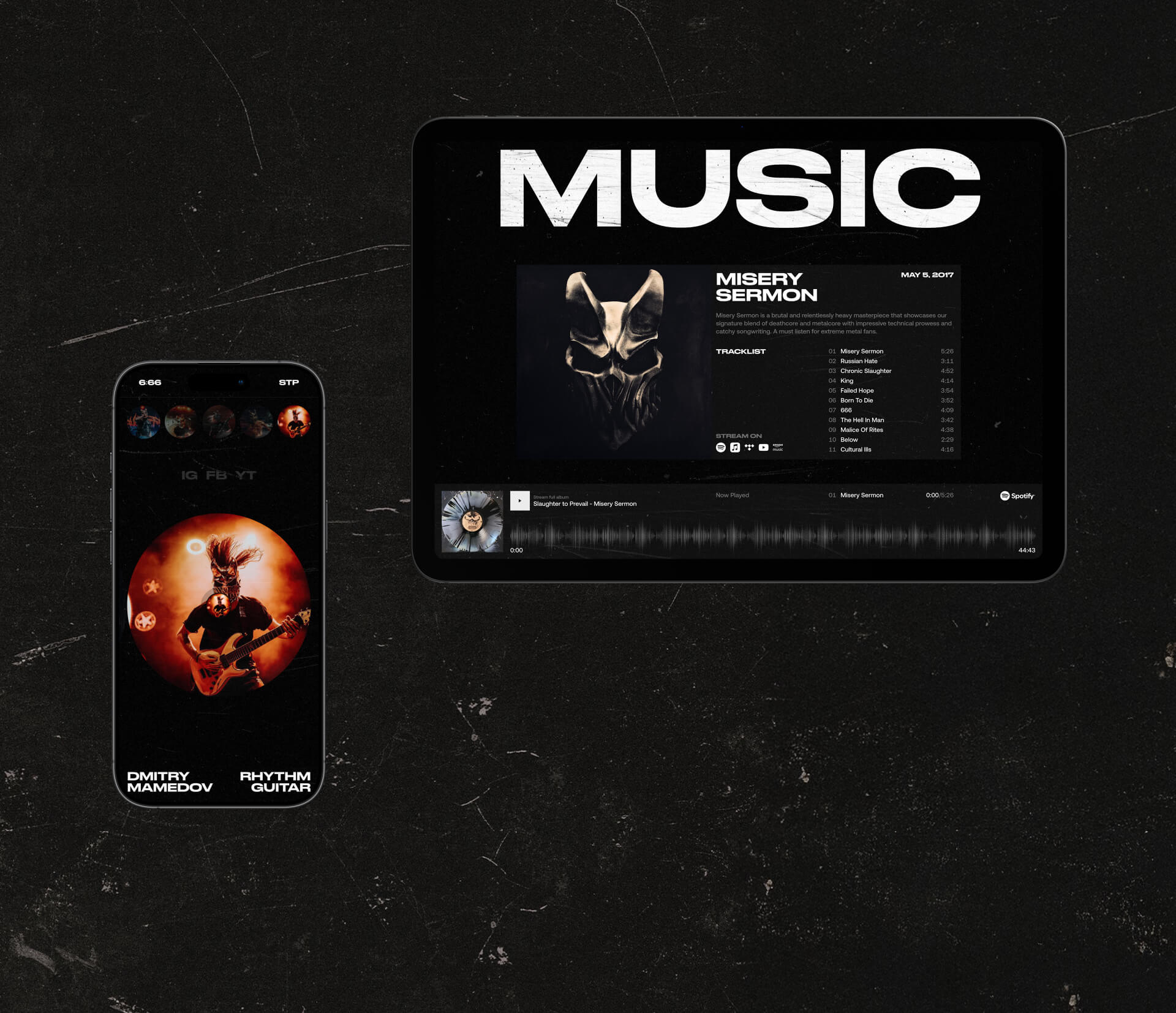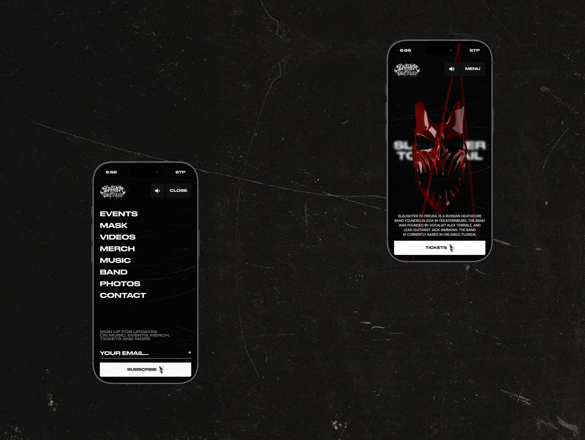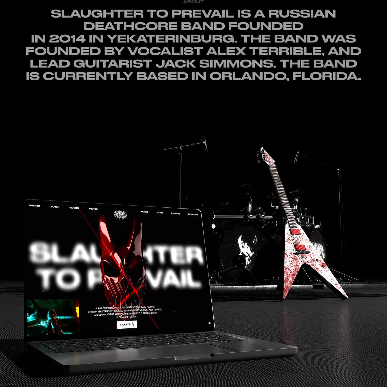 Почувствуйте мощь Slaughter to Prevail онлайн: концепция веб-сайта, воплощающая их брутальное звучание. Мы хотели выйти за рамки повседневной рутины и сделать что-то кричащее, использовав при этом акцентную типографику, 3D и впечатляющую анимацию. Так появился этот концепт сайта.