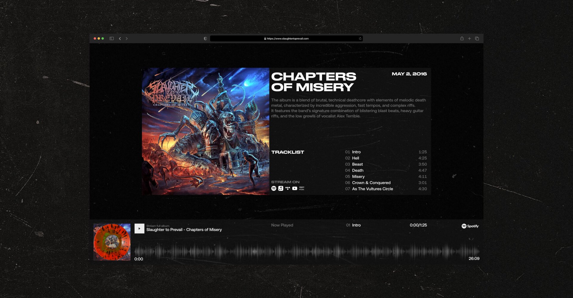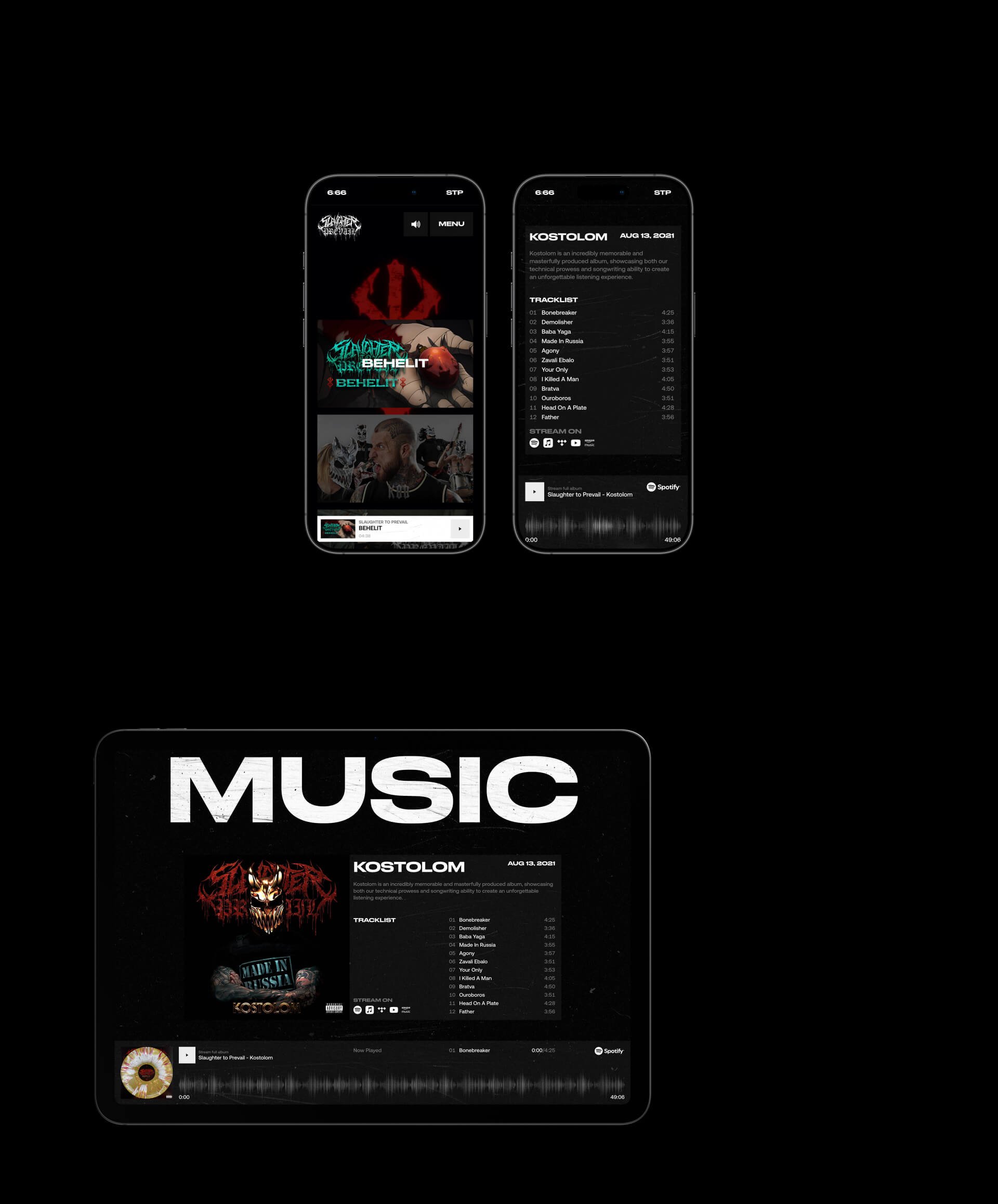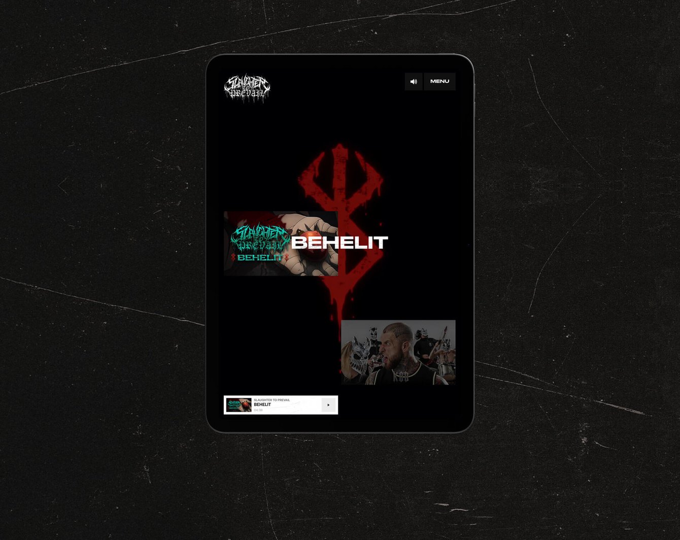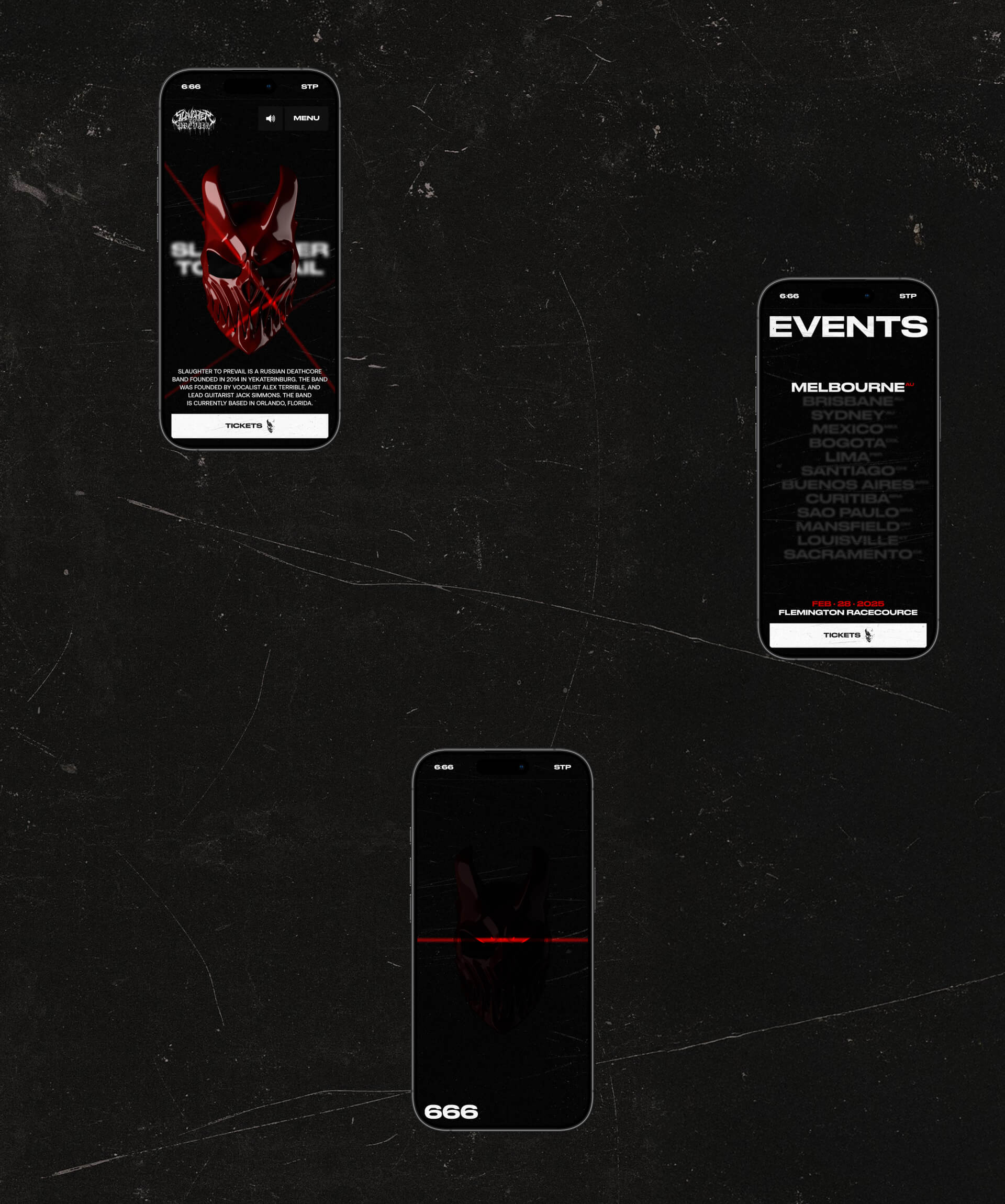 Почувствуйте мощь Slaughter to Prevail онлайн: концепция веб-сайта, воплощающая их брутальное звучание. Мы хотели выйти за рамки повседневной рутины и сделать что-то кричащее, использовав при этом акцентную типографику, 3D и впечатляющую анимацию. Так появился этот концепт сайта.
