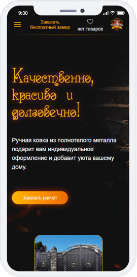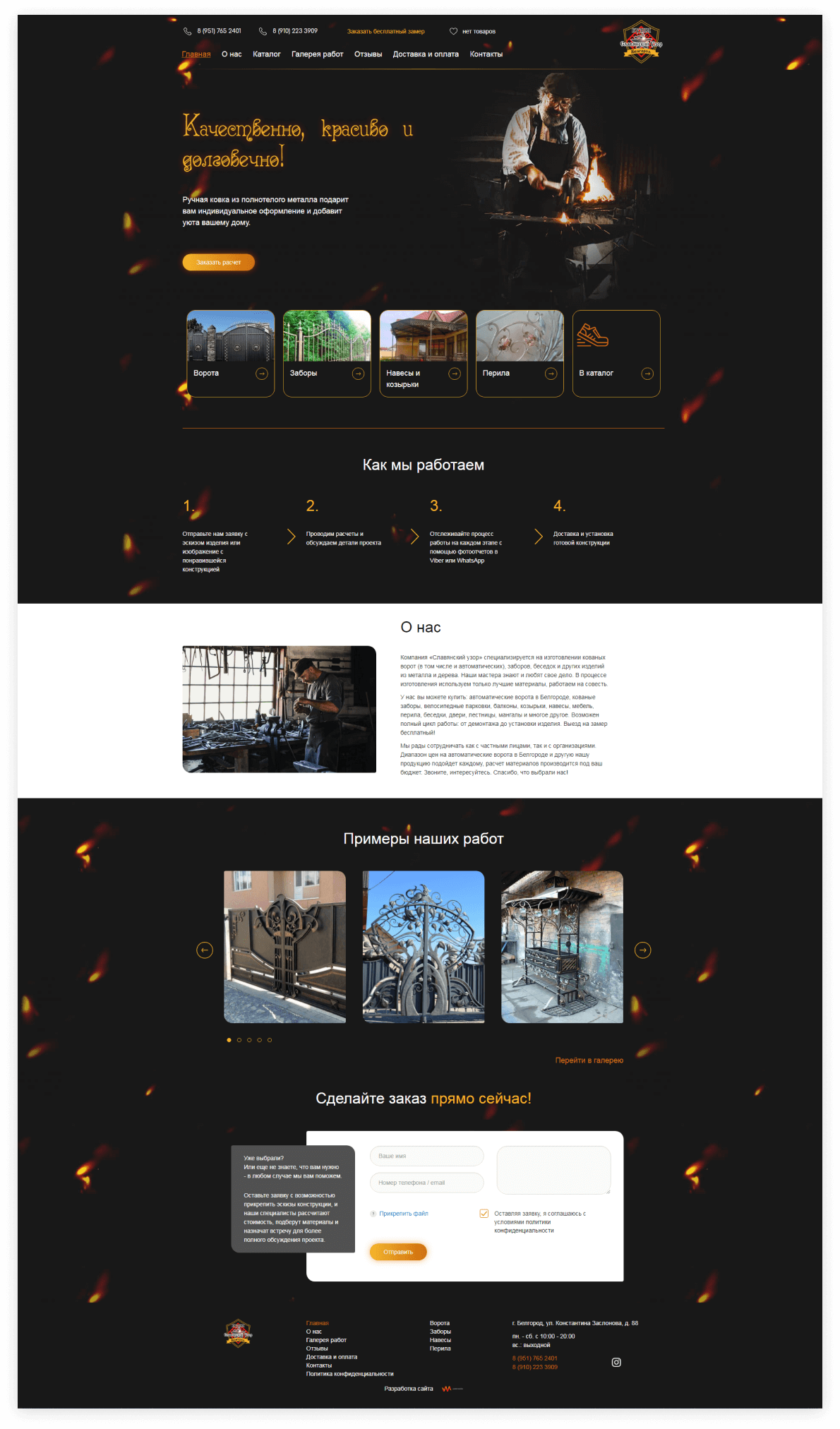 Для дизайна были выбраны не только цвета, которые ассоциируются с кузничным делом, металлом и огнем, но и шрифты для заголовков, которые визуально похожи на витиеватые узоры, так часто встречающиеся в готовых изделиях.
