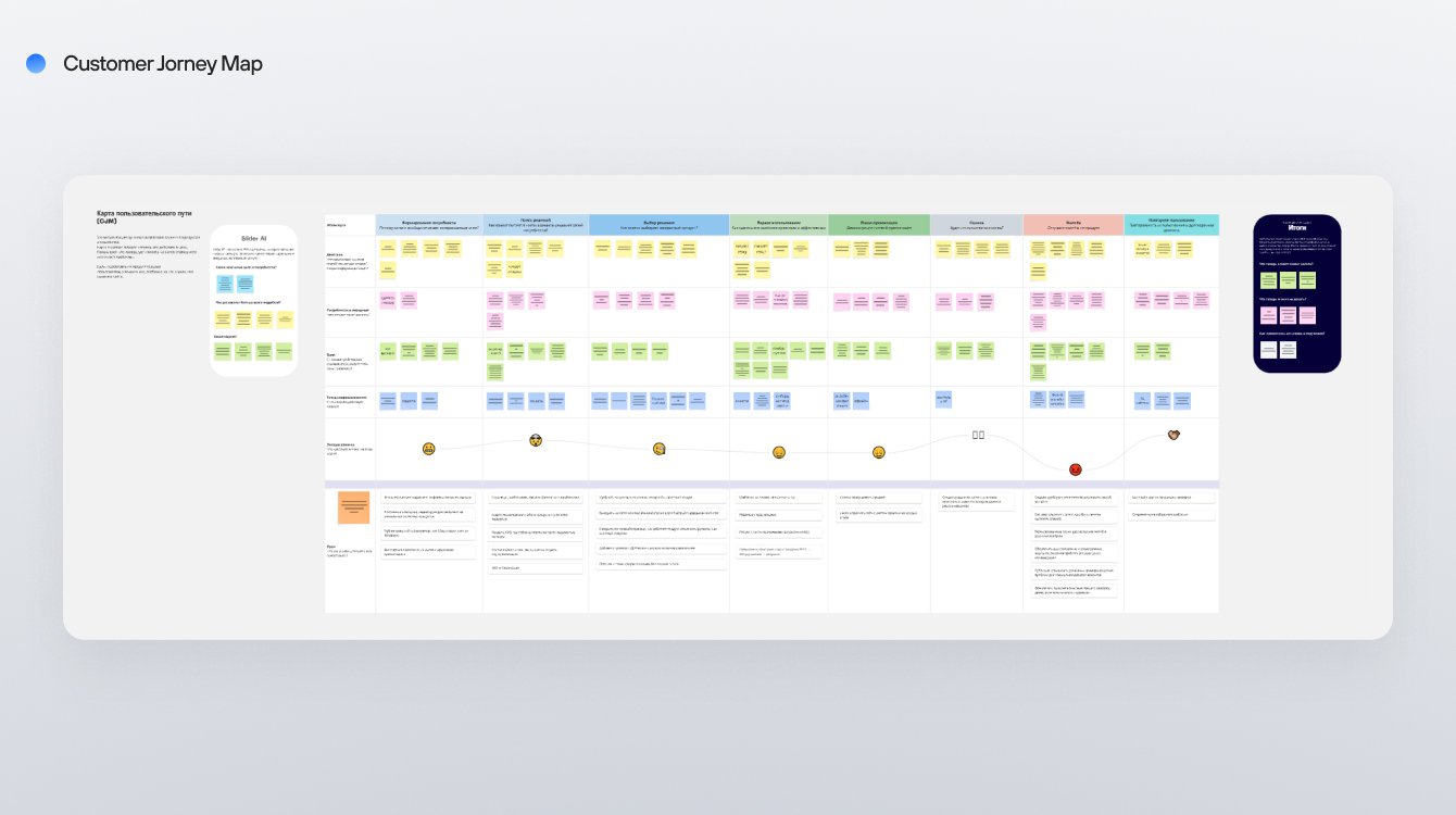 ✔️ Вторым шагом стало построение CJM. Мы построили путь пользователя Slider Ai от зарождения потребности до решения о повторном использовании. Проследили: