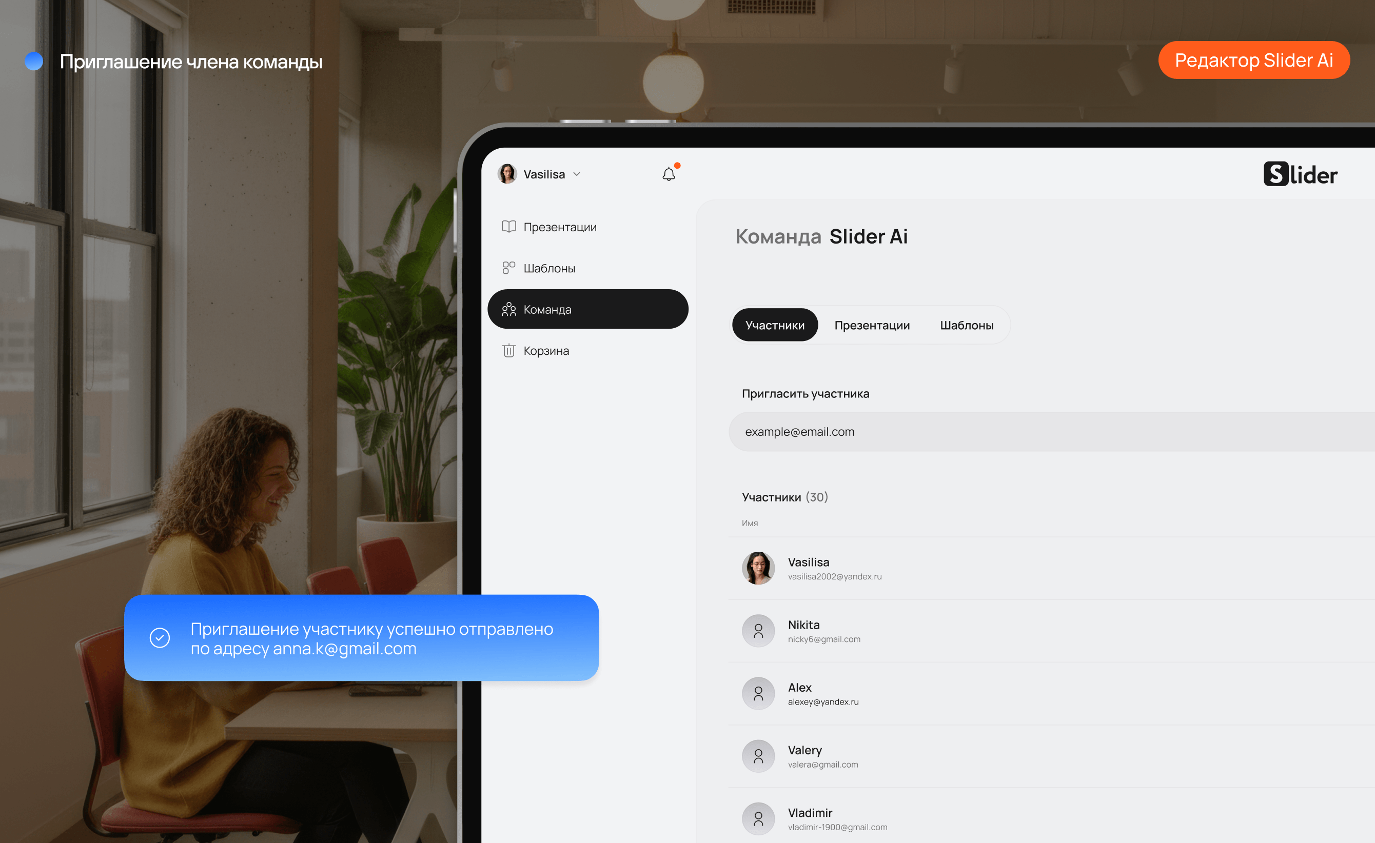 Нам было важно, чтобы раздел был интуитивно понятным. Поэтому мы до мелочей продумали логику пути пользователя и сделали его максимально простым и понятным. Например, на вкладке «Участники» добавили блок приглашения члена команды. Он встроен в саму систему, поэтому пользователь не тратит время на переход в почту или открытие поп-апа.