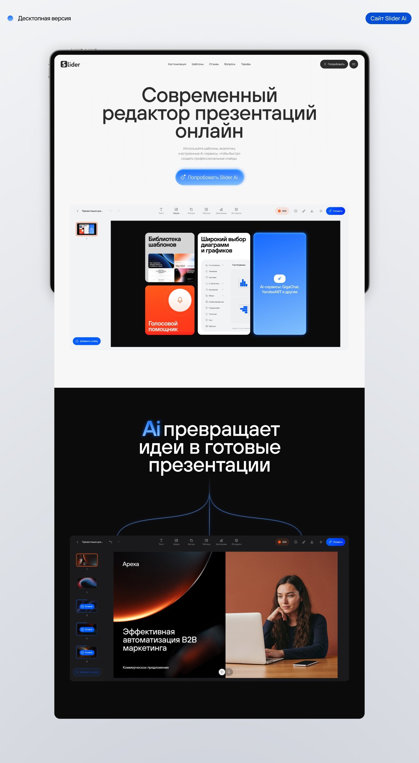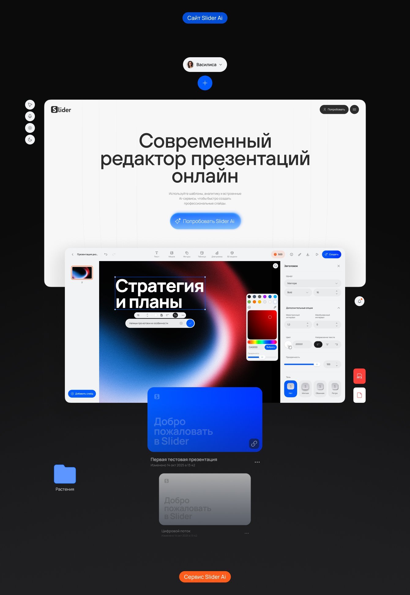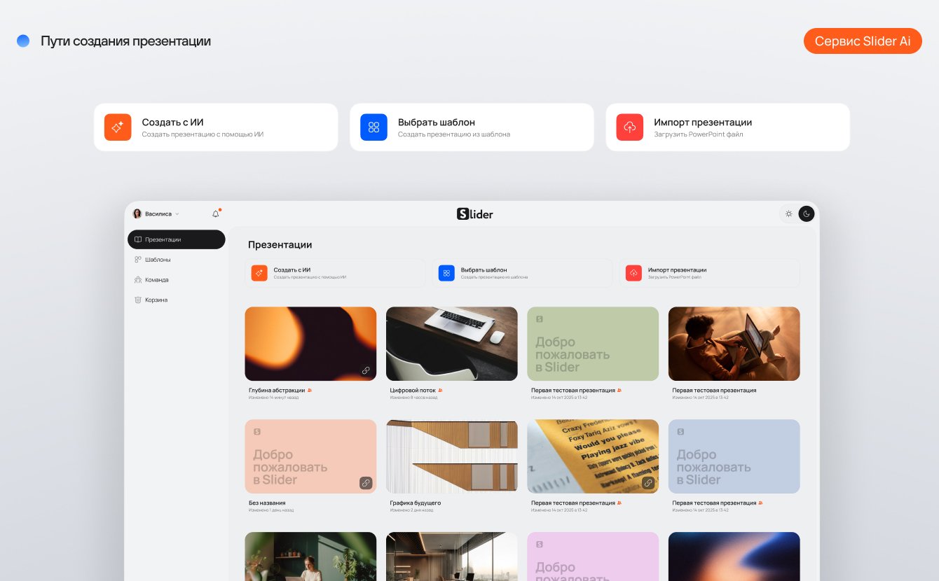 Slider Ai — российский сервис для создания презентаций с помощью голосового управления, ИИ, шаблонов и аналитики.