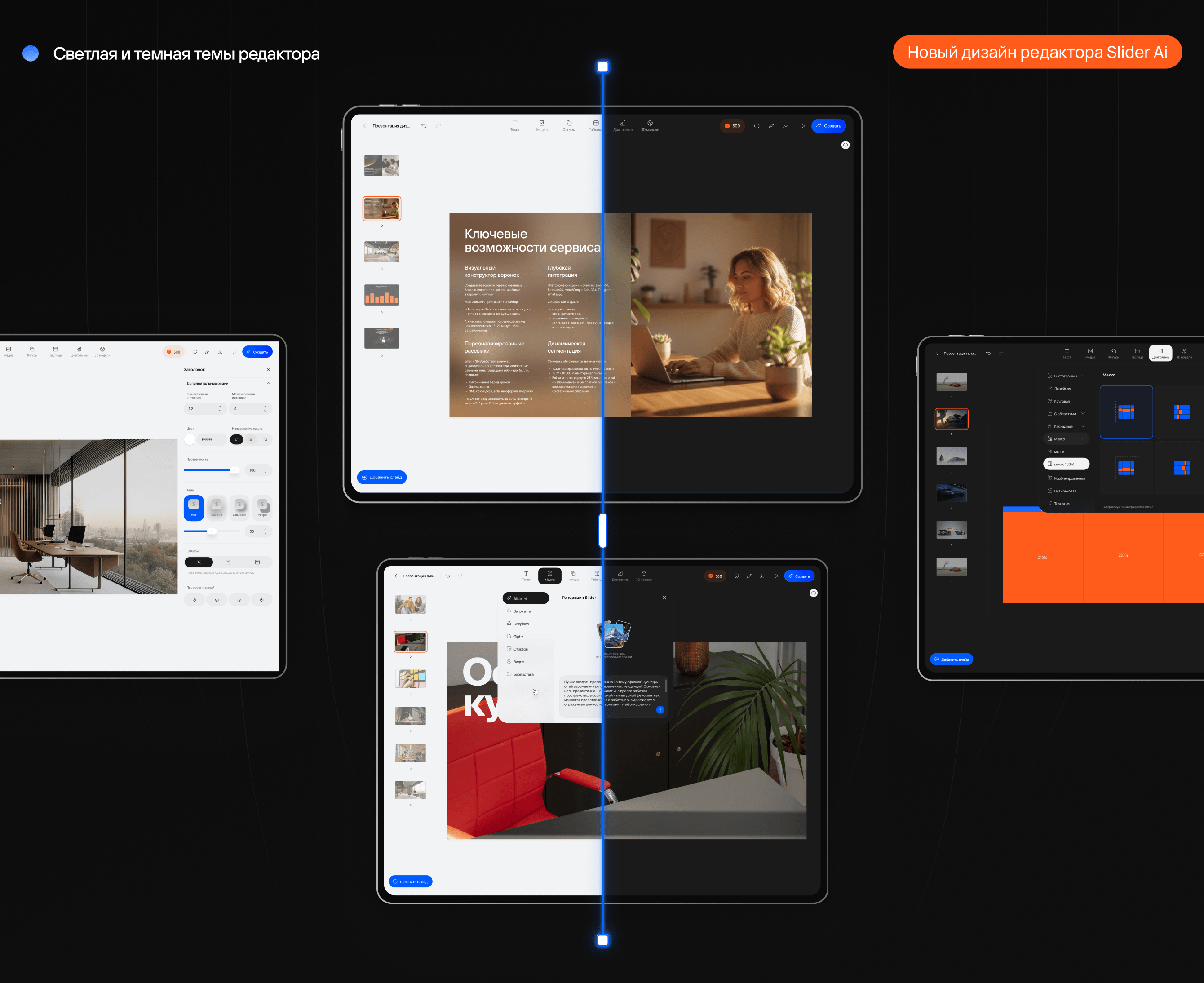 Поэтому при обновлении редактора презентаций Slider Ai мы сосредоточились на самом главном для повышения лояльности пользователей — на визуале (структура редактора хорошая и не требовала сильной переработки).