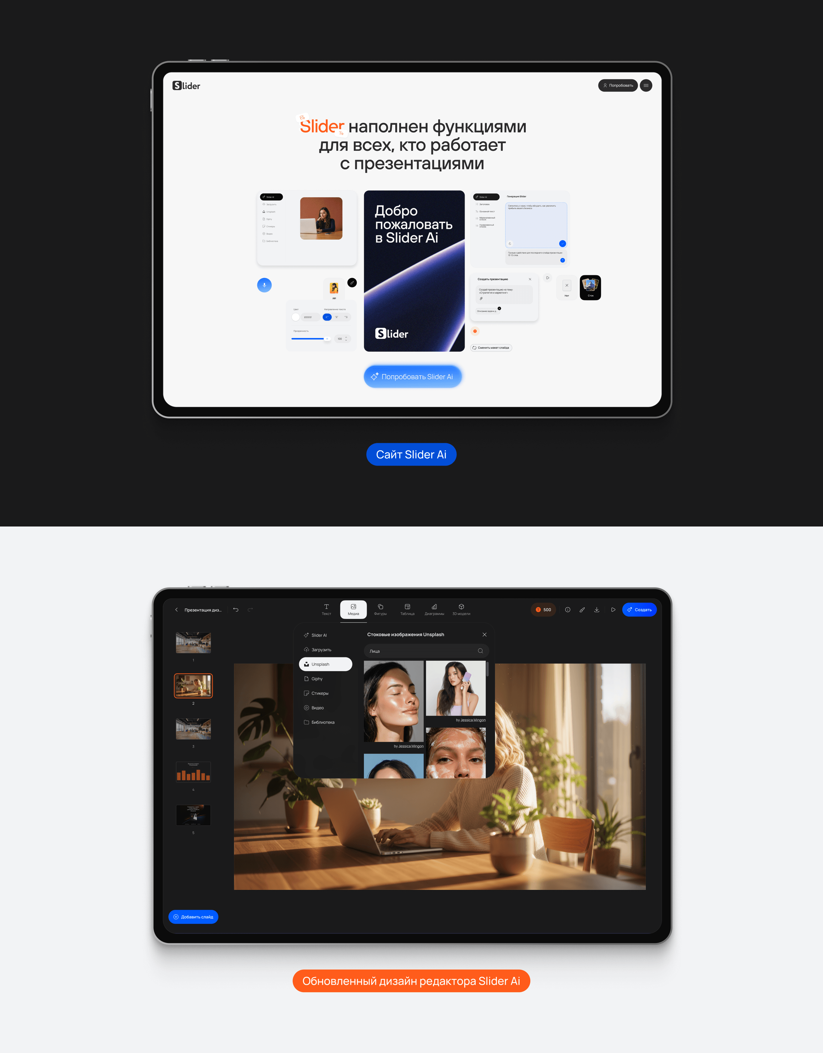 Дело в том, что в процессе работы над сайтом мы обнаружили, что визуал самого редактора презентаций Slider Ai выглядит не так современно. И если бы мы просто добавили его скрины на сайт, то он бы плохо работал на задачу клиента — привлекать новых пользователей.