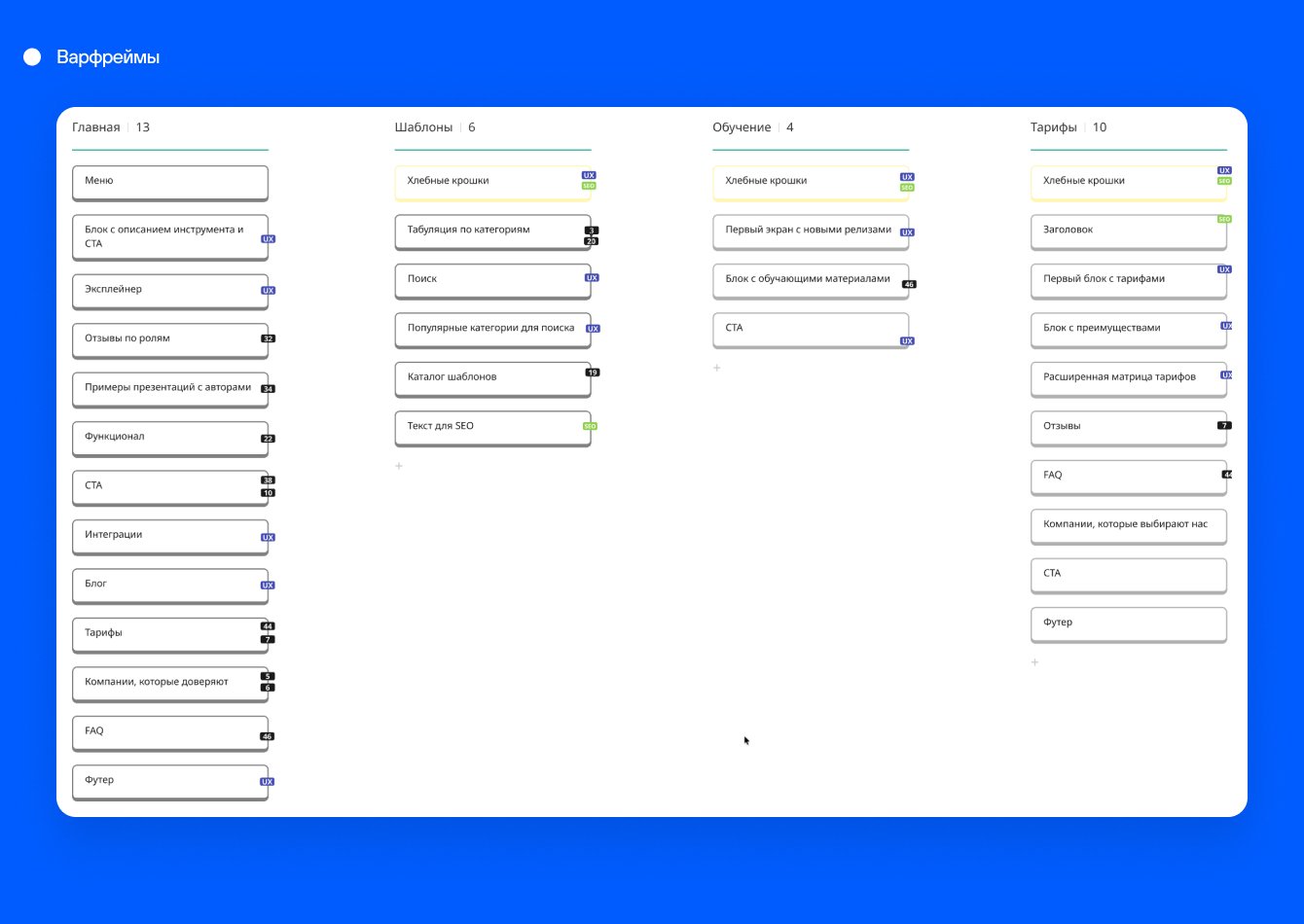 По итогу мы создали варфреймы будущего сайта: удобные для пользователей, понятные поисковикам и закрывающие боли, найденные на этапе аналитики.
