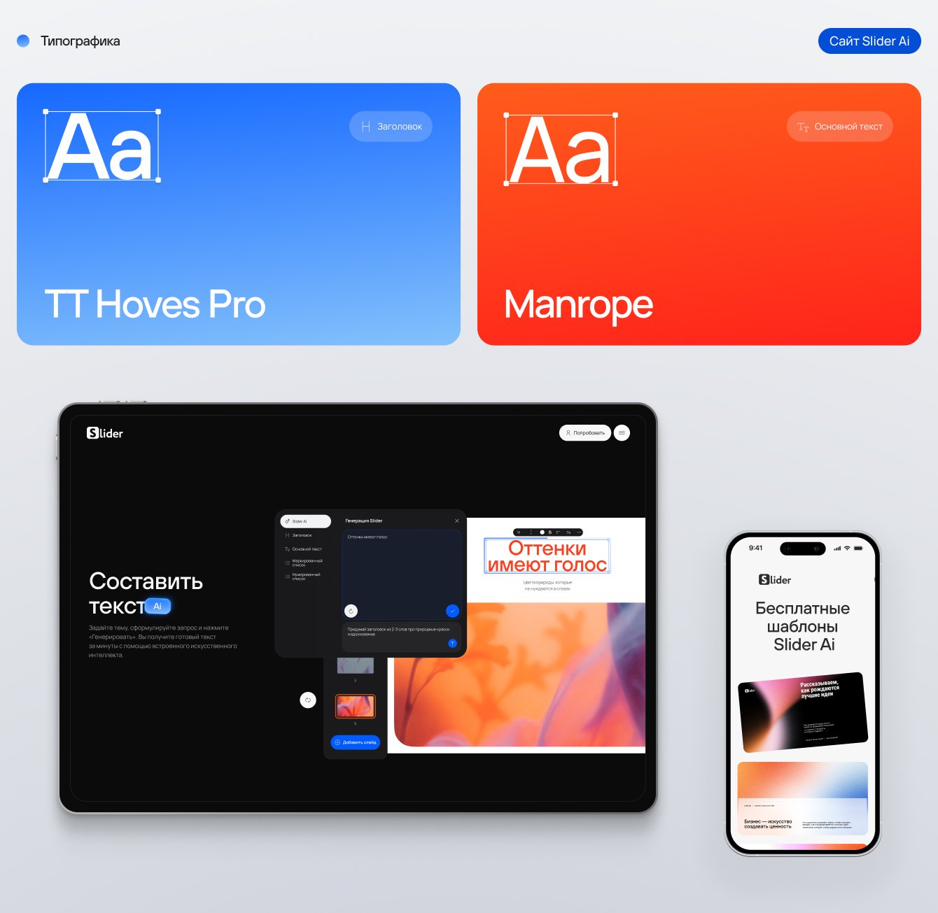 Минималистичный дизайн и практичные гротескные шрифты Manrope и TT Hoves Pro также подчеркивают технологичность продукта.