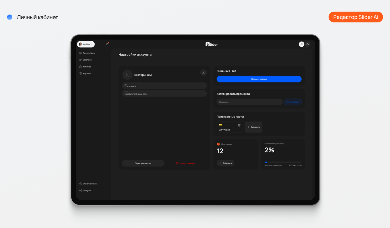 Личный кабинет Slider Ai — важный раздел внутри редактора презентаций. Тут пользователь управляет подпиской, данными, а также видит разделы со своими презентациями, шаблонами, командой, корзиной.