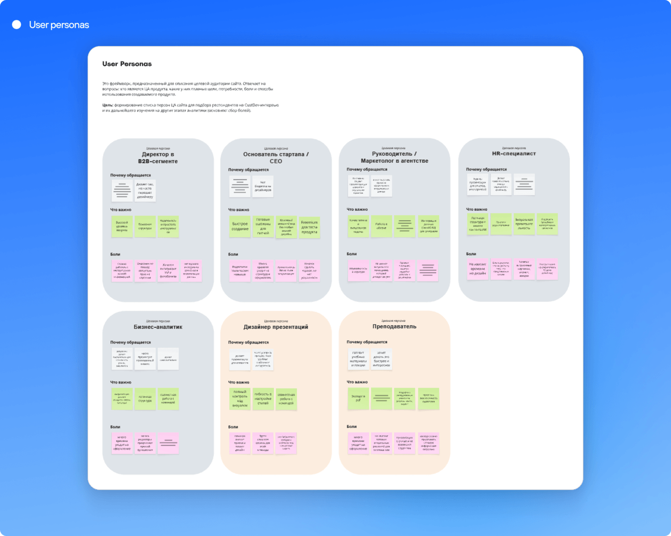 Через опросы мы собрали ключевые боли пользователей. Например, узнали, что одна из главных болей аудитории — страх чистого листа. Кроме того, у многих представителей целевой аудитории нет навыков и времени на работу с продвинутыми редакторами, такими как Figma. При этом делать презентации приходится часто: фаундеру, например, — чтобы запитчить стартап перед инвесторами, а бизнес-аналитику — чтобы представить отчёт руководству.
