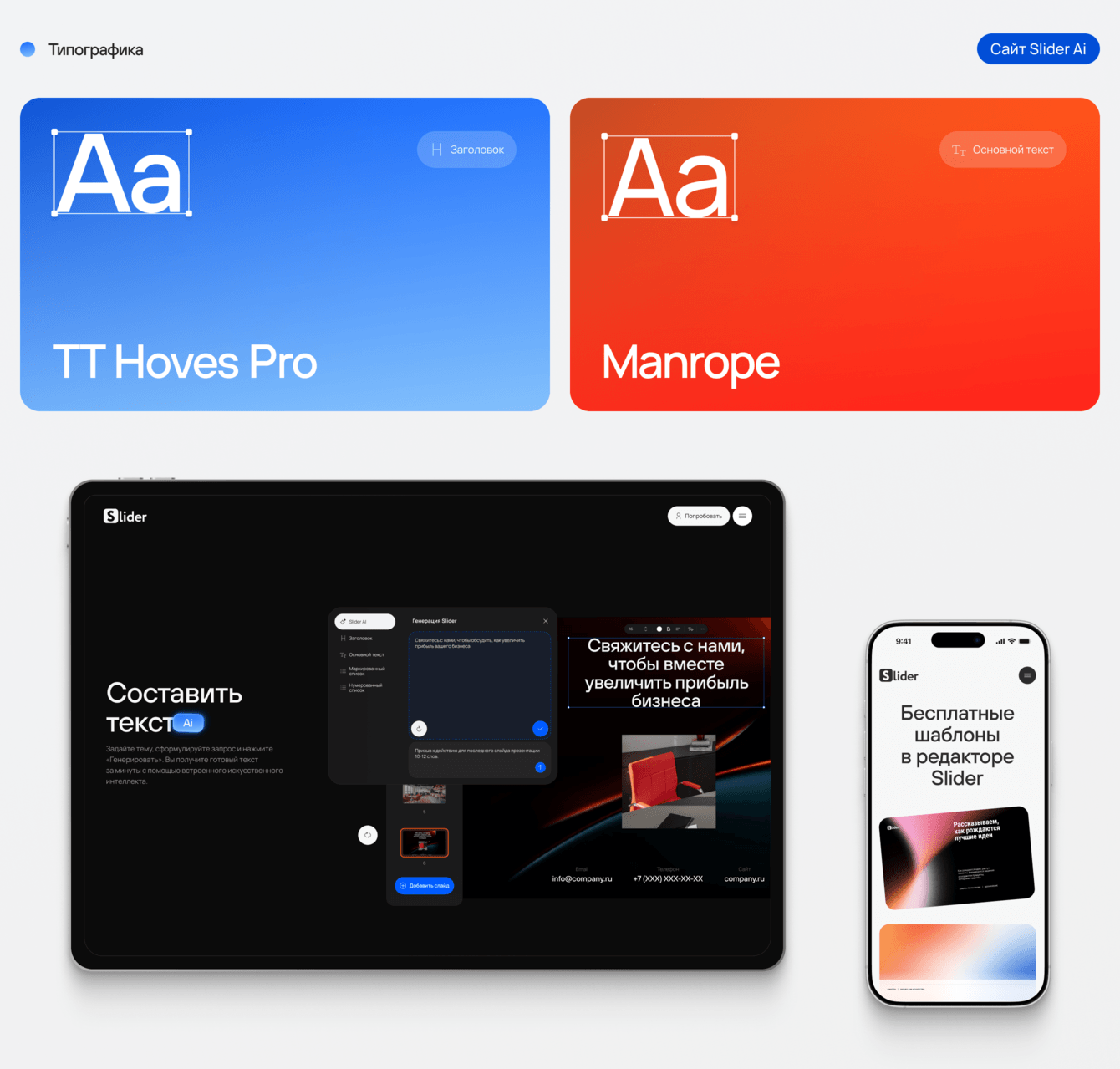Интересный вызов: сайт должен был показывать технологичность продукта, подсвечивать работу с Ai — но при этом быть человечным и вызывать эмоции у пользователей. Это отражает подход команды Slider Ai: коллеги часто подчеркивают, что ИИ — это лишь экзоскелет, помощник в работе. А создаёт презентацию всё-таки человек.