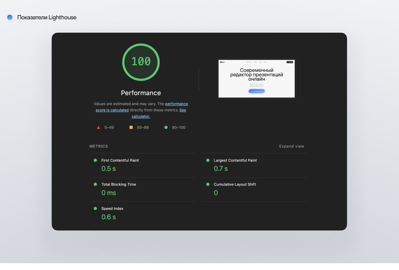 • Показатель скорости загрузки сайта — 100/100 баллов по Lighthouse, что быстрее 98% всех сайтов мира!