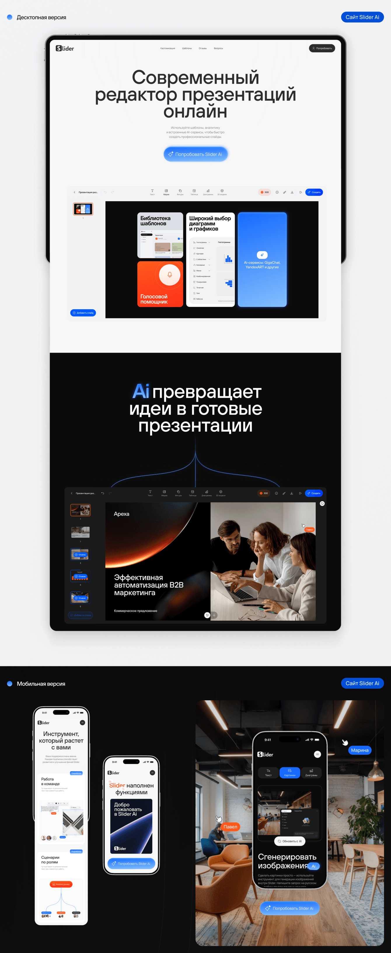 Разработали дизайн десктопной и мобильной версии сайта (главная + 14 внутренних страниц с состояниями). Теперь пользователь может посмотреть, как работает редактор презентаций Slider Ai — просто находясь на сайте. Ему не нужно переходить в сервис, чтобы понять его визуал, функционал, особенности — мы добавили на сайт анимации, которые в реальном времени показывают, как работает редактор презентаций Slider Ai.