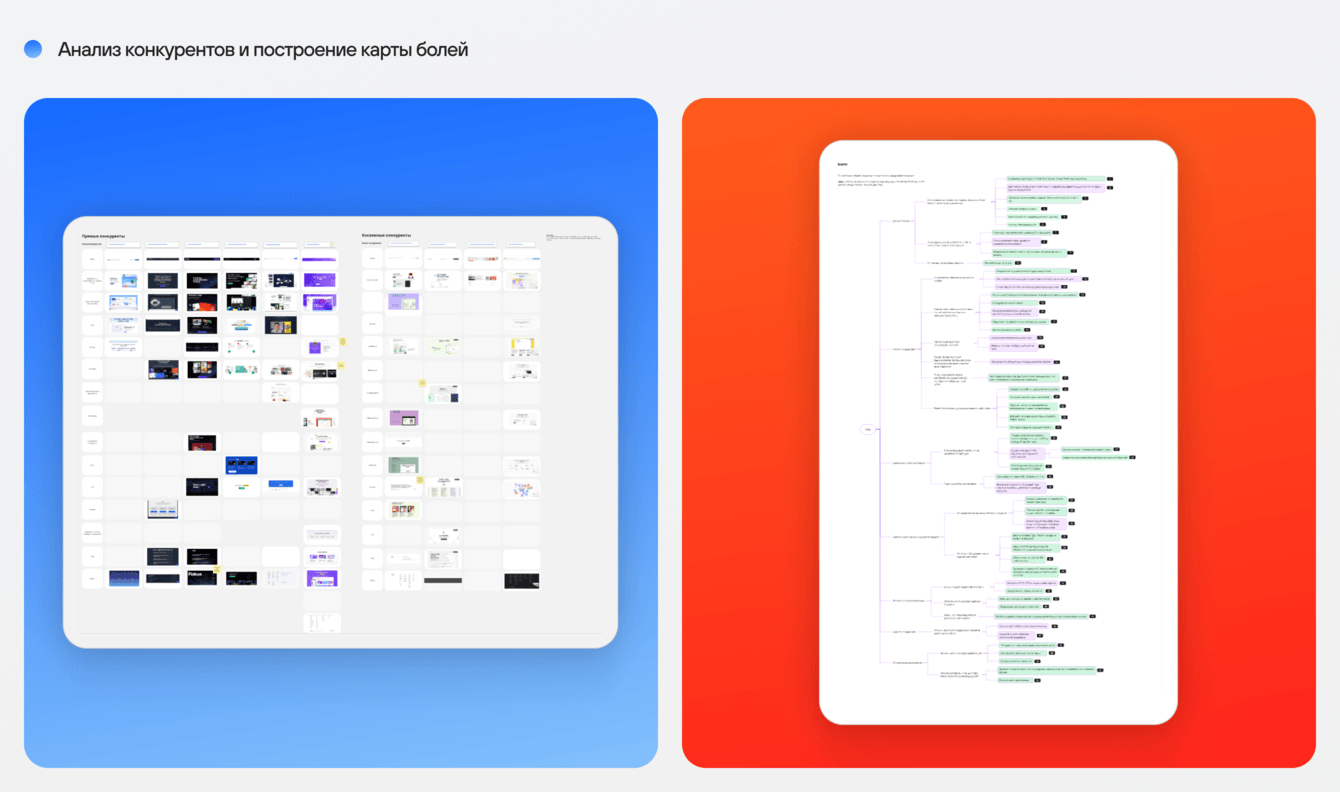 Следующий шаг — анализ рынка клиента. Мы изучили российские и зарубежные сервисы по работе с презентациями, сервисы-помощники со встроенным ИИ, графические редакторы, интерактивные онлайн-доски и т.д. — и проанализировали лучшие решения по блокам: