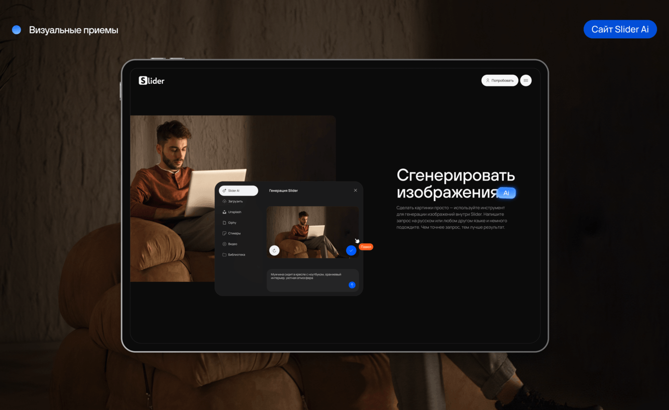А технологичность показали через демонстрацию самого продукта: использовали фото и анимации редактора Slider Ai по ходу скролла страницы. Например, показали, как пользователь может генерировать элементы презентации или как реализованы переходы между слайдами. Такое решение ещё и закрывает боль «недостаток навыков работы с продвинутыми редакторами». Пользователь сразу понимает, как работает редактор, и не тратит время на онбординг.