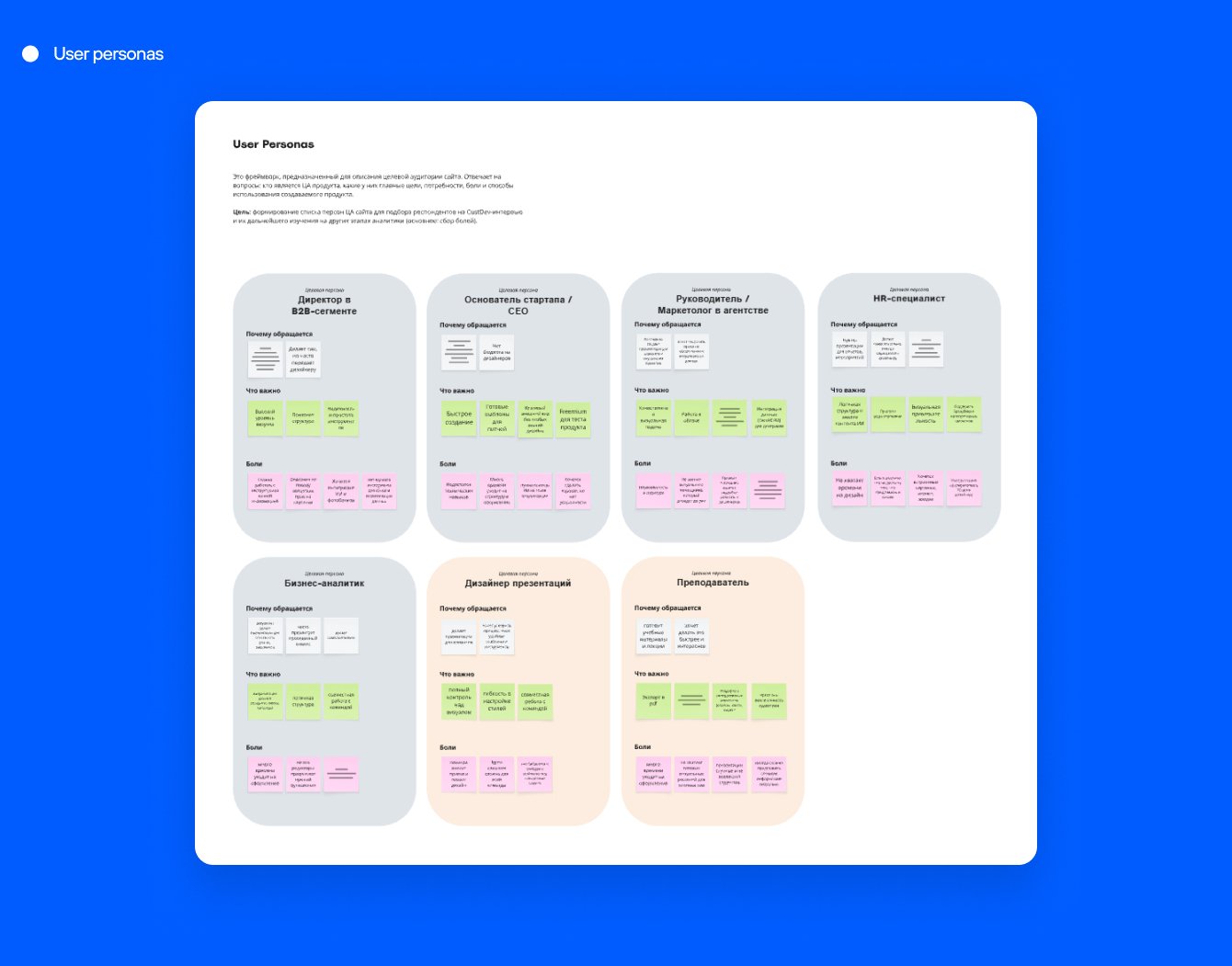 Например, мы узнали, что одна из главных болей аудитории при создании презентаций — страх чистого листа. Кроме того, у многих представителей целевой аудитории нет навыков и времени на работу с продвинутыми редакторами, такими как Figma. При этом делать презентации приходится часто: фаундеру, например, — чтобы запитчить стартап перед инвесторами, а бизнес-аналитику — чтобы представить отчёт руководству.