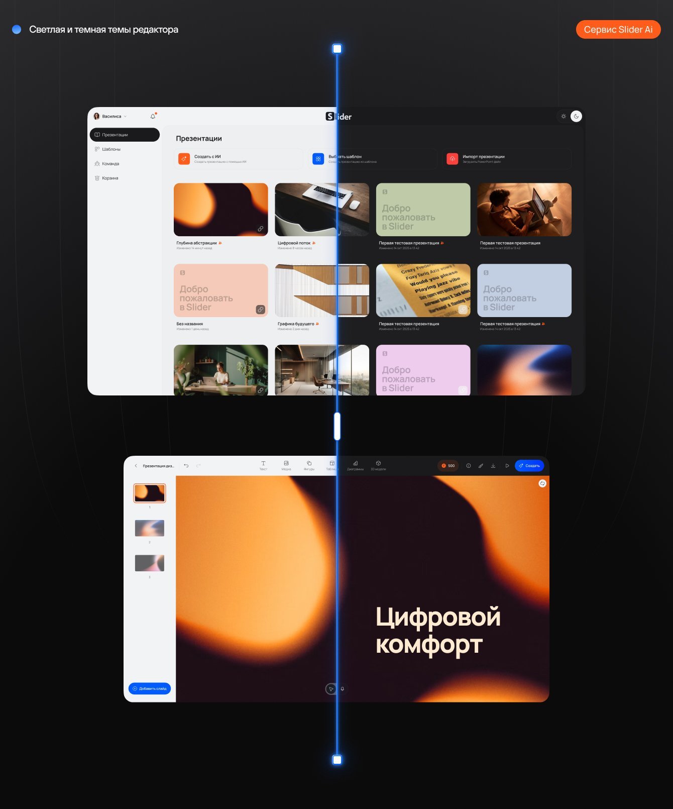 Но в процессе создания сайта мы поняли, что важно обновить и дизайн самого редактора презентаций Slider Ai. Чтобы сайт стал лучшим в своем сегменте и отражал технологичность редактора Slider Ai — на нем должен быть качественный визуал самого сервиса.