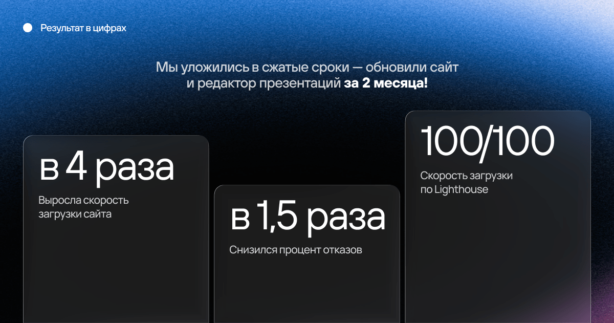 • Скорость загрузки сайта выросла в 4 раза (несмотря на то, что сайт стал гораздо более масштабным и с множеством анимаций);
