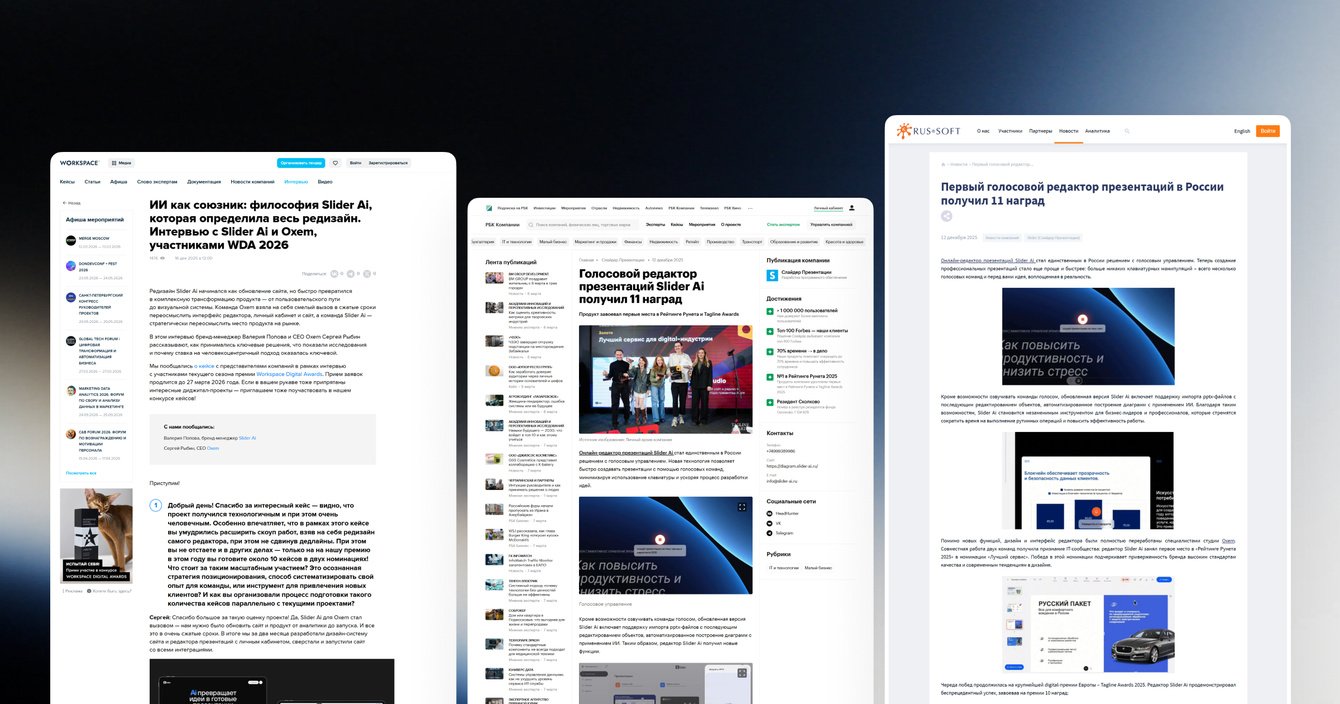 💥 В результате Slider Ai уже получили звание лучшего сервиса 2025 года по версии премии Рейтинг Рунета, 10 наград Tagline Awards 2025 (среди которых «Лучший B2B проект» и «Лучший сервис для digital-индустрии») — и награды «Лучшее на Dprofile» и «Интерфейсы» по версии площадки Dprofile в 2026 году.