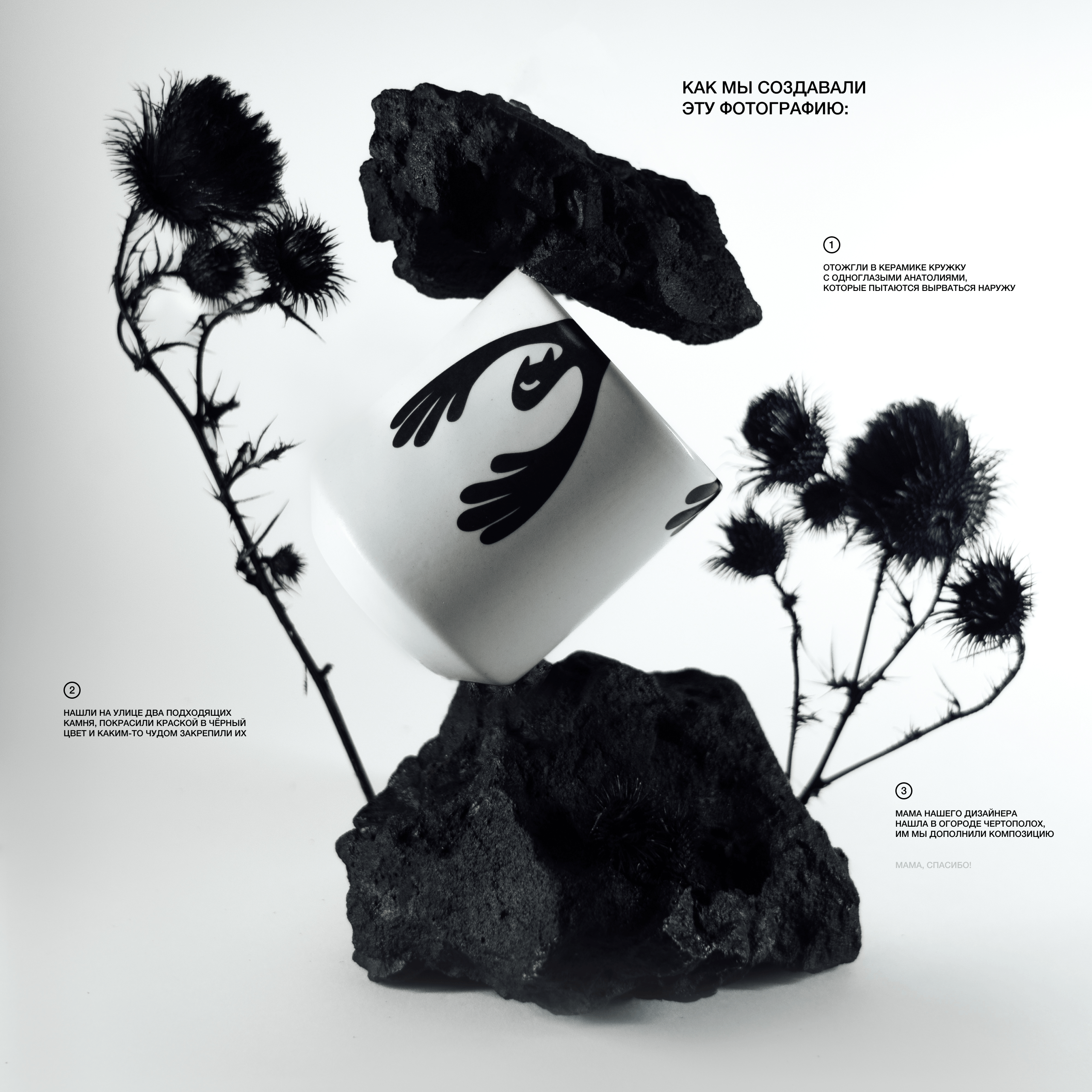 Сцену для фотосета и промо-кампании кружки мы создавали без использования нейронок и 3D-редакторов: нашли на улице два камня подходящей формы, куст чертополоха в огороде мамы нашего бренд-дизайнера, выкрасили всё в чёрный цвет и собрали кадр.