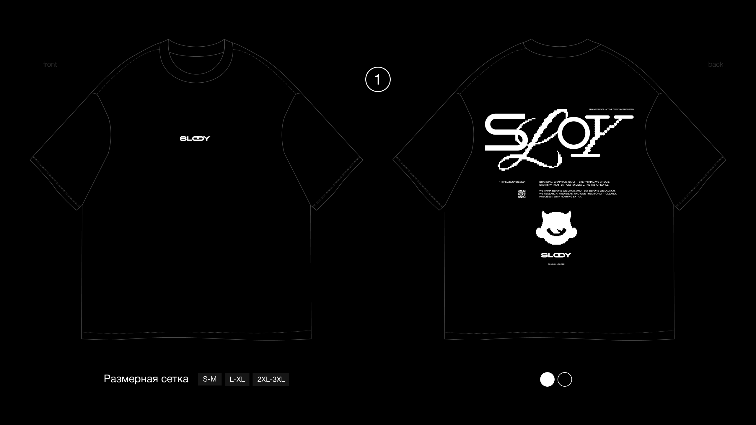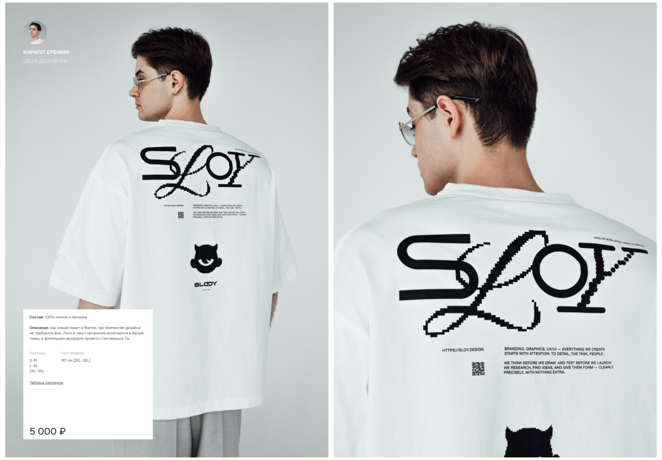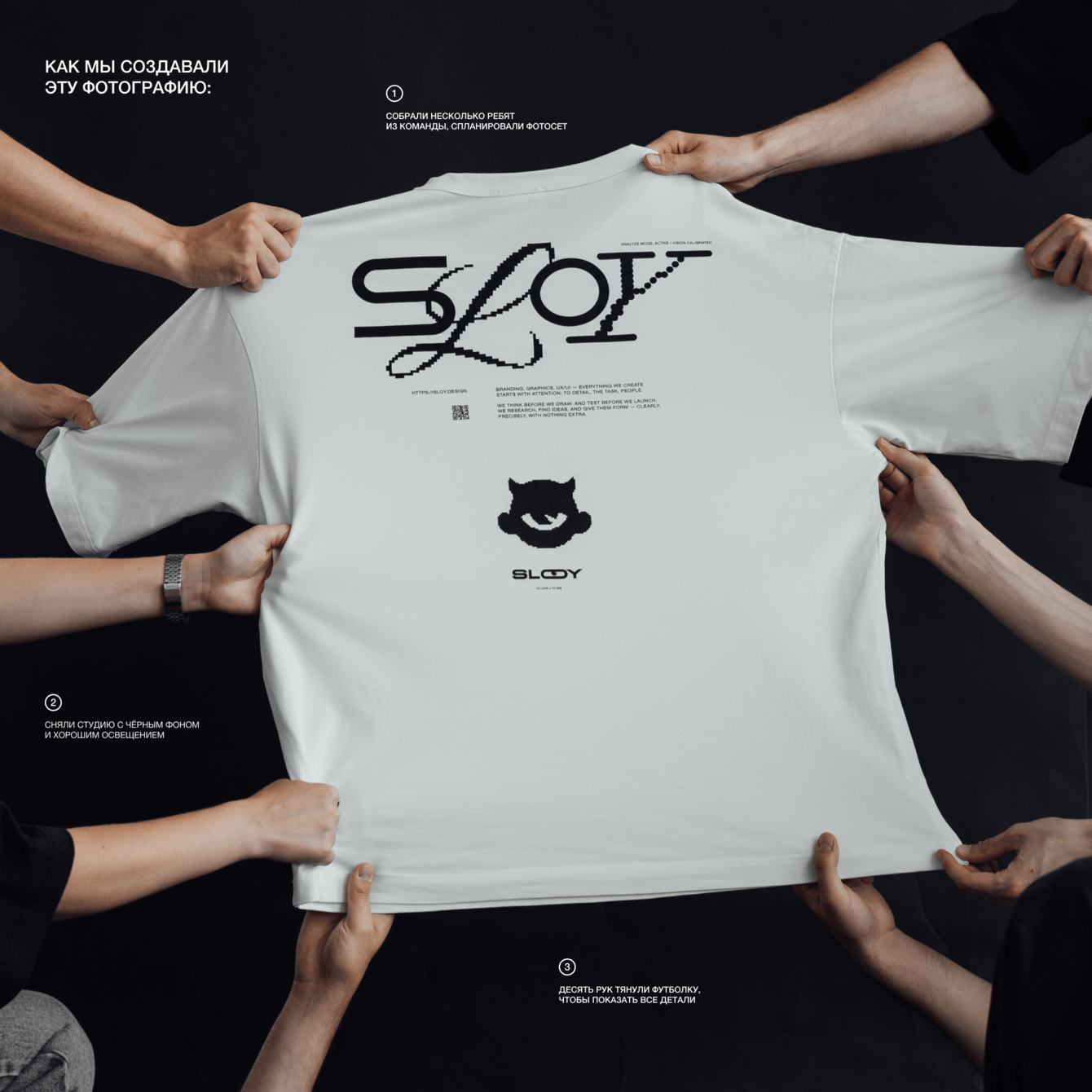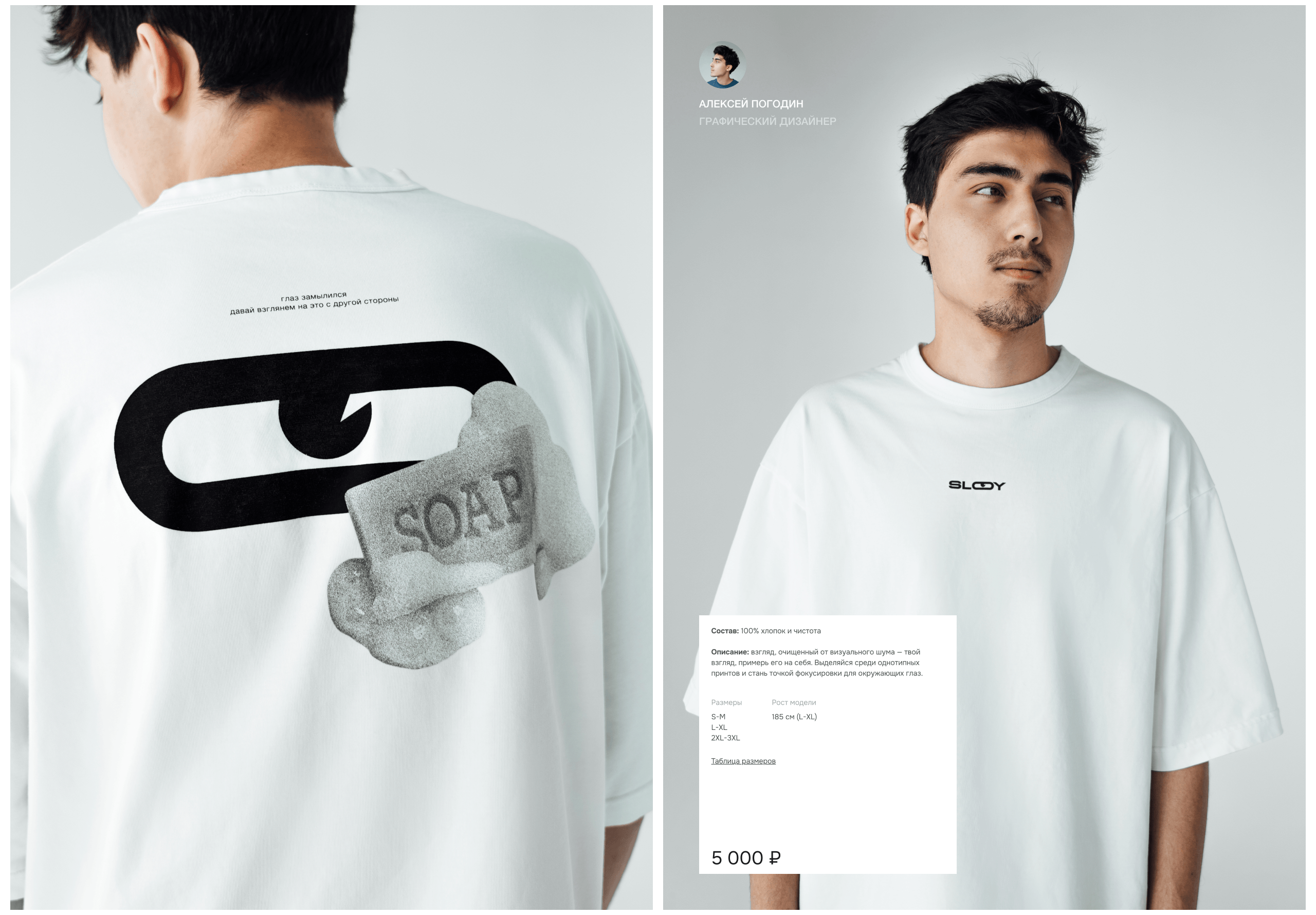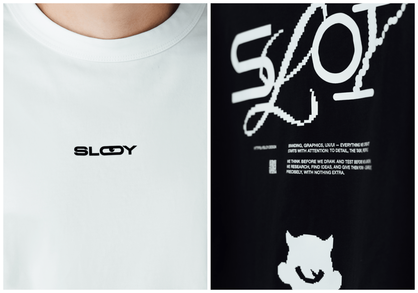 Вместо банальных принтов команда наших бренд-дизайнеров разработала больше десятка свежих идей. Из всех визуальных решений мы выбрали трёх финалистов: принты с (пока ещё безымянным) маскотом студии в чёрном и белом цветовых вариантах и один концепт футболки «Глаз замылился» — олдскульное мыло, крылатая дизайнерская фраза, логотип SLOY и чистый минимализм.