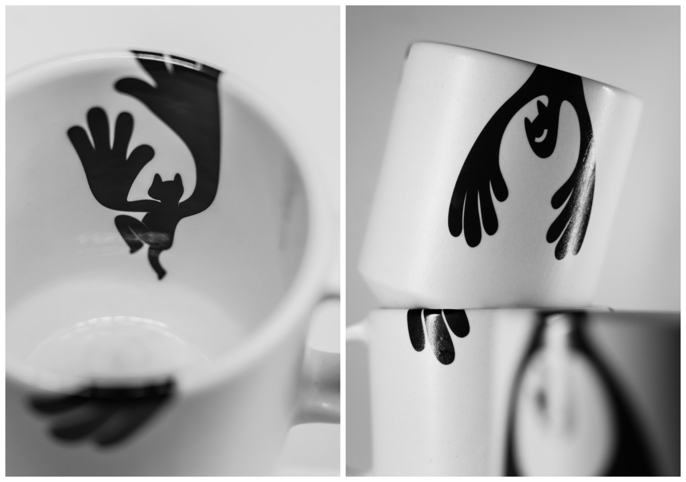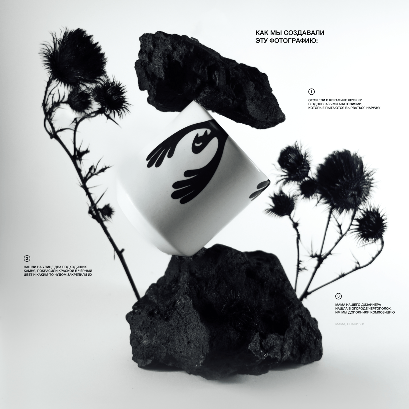 Наш мифический персонаж, одноглазый маскот, который изображен на футболках и стикерах, в какой-то момент перебрался в новую объёмную локацию — в пространство керамической кружки, которую мы выпустили совместно с локальным брендом SALOEV.