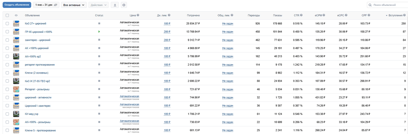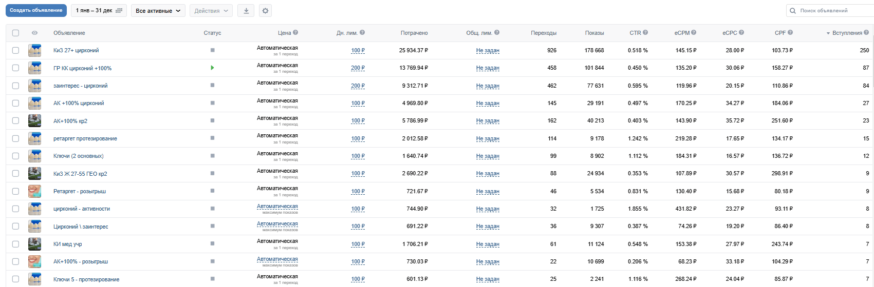 1. Наибольшее количество вступлений (250) получено через объявление "КиЗ 27+ цирконий" с хорошим показателем CPF 103.73 ₽