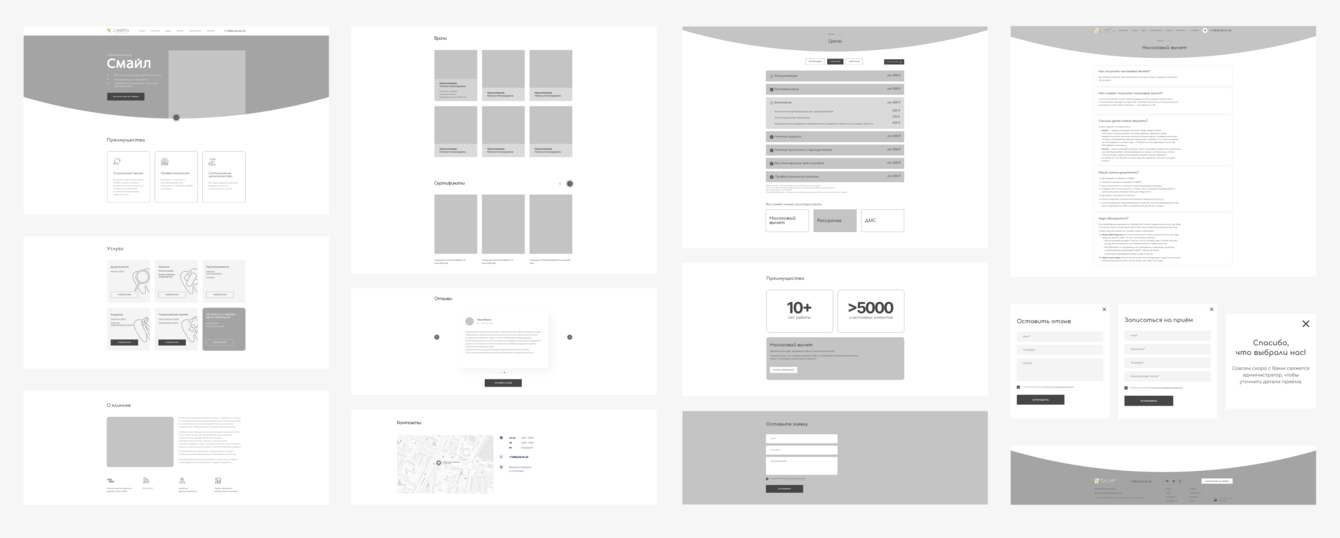 Мы разработали последовательность вайрфреймов, демонстрирующих эволюцию дизайна сайта. Начали с базовой структуры и постепенно наполняли её деталями, что позволило наглядно представить финальный вид проекта.