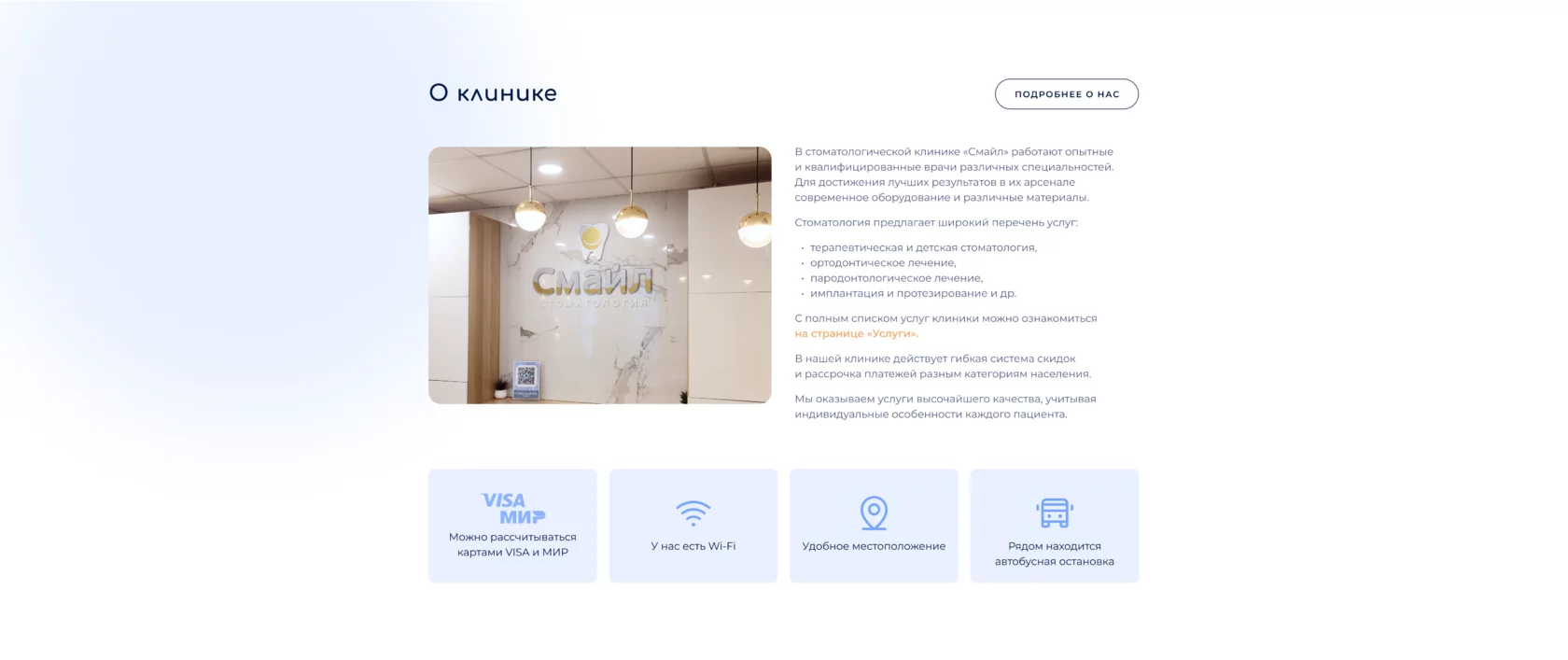 Дизайн-концепция стоматологической клиники воплощает передовые технологии веб-разработки и глубокое понимание потребностей пациентов. Интуитивно понятный интерфейс создан на основе актуальных UX-исследований и обратной связи от клиентов.