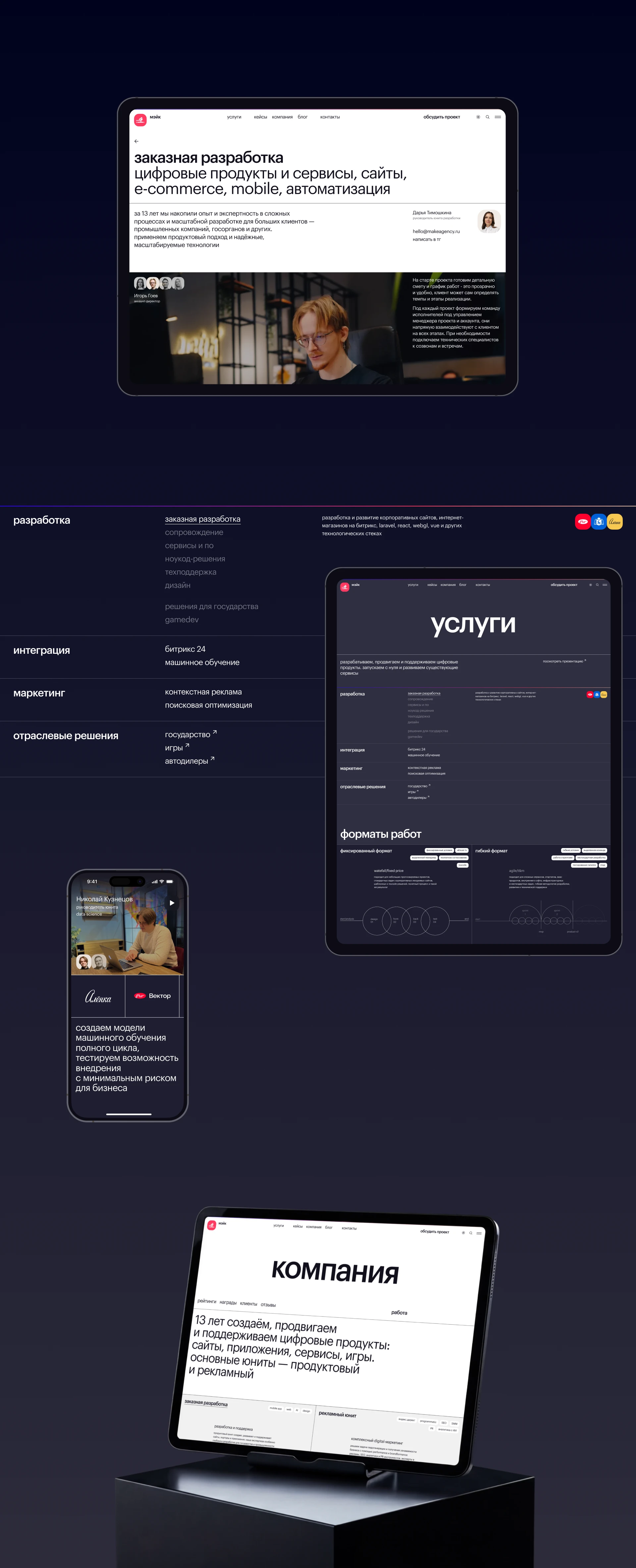 Первый экран — это не красивый креатив, а структурированные направления: разработка, поддержка, маркетинг, автоматизация, корпоративные продукты. Делаем упор не на креатив, а на компетенции.