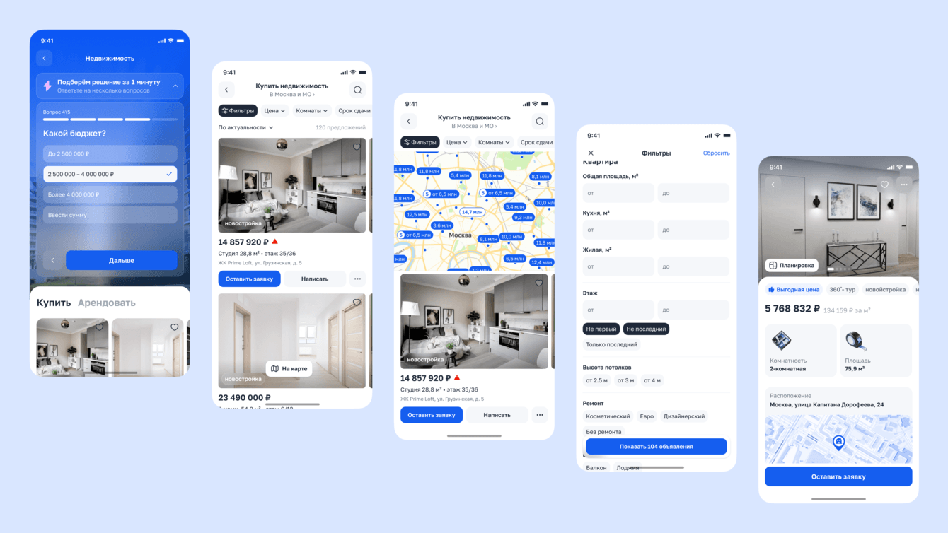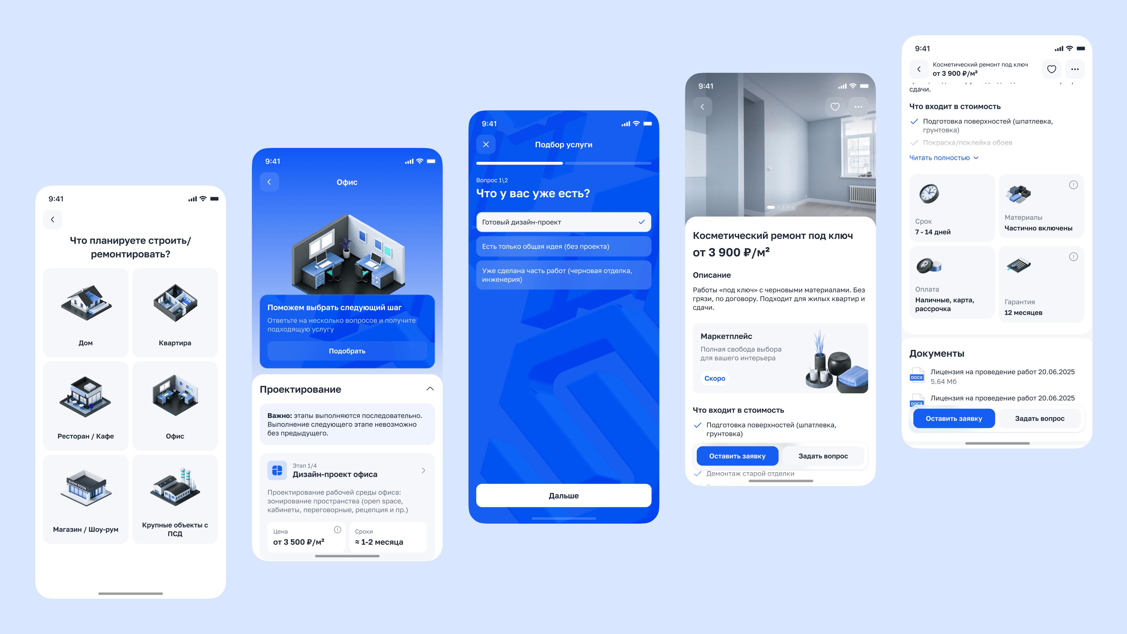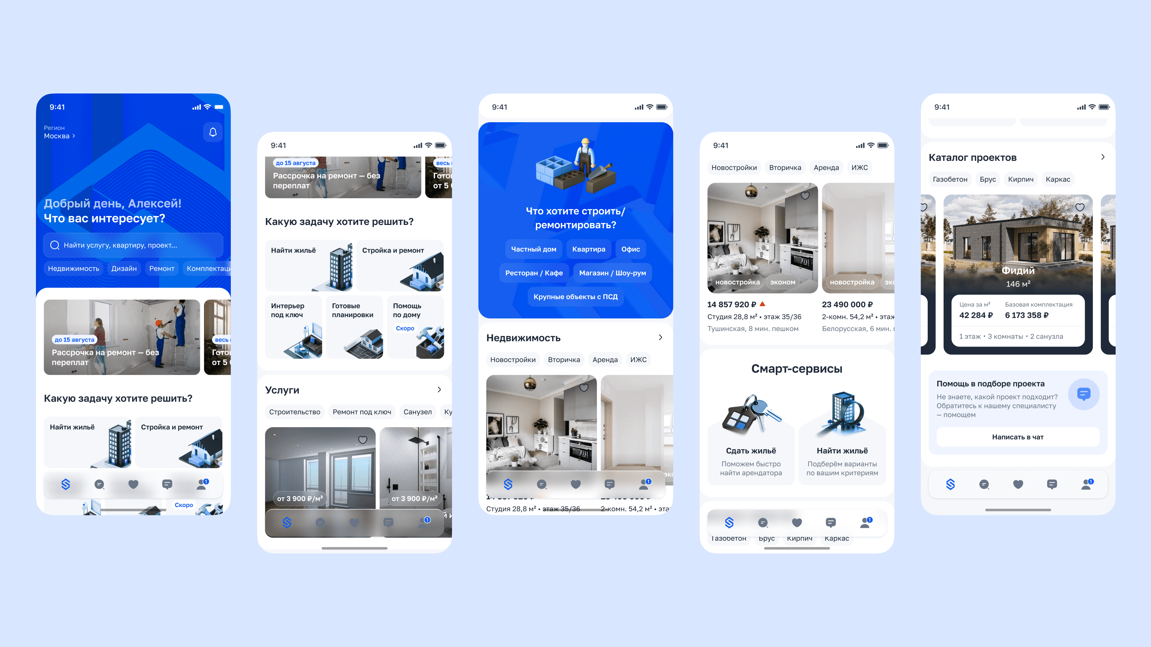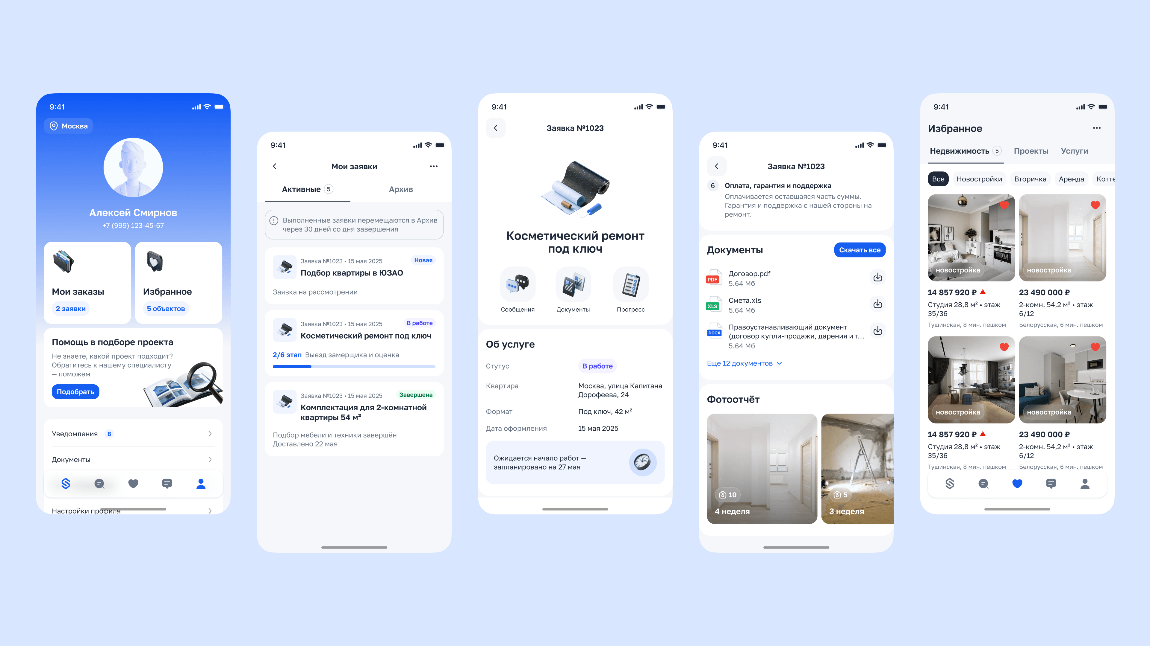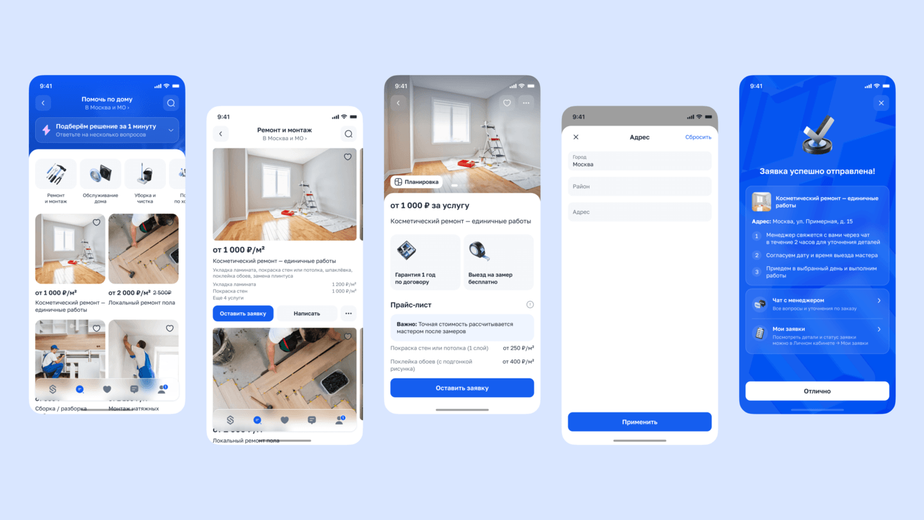 Приложение закрывает полный путь клиента в сфере недвижимости и ремонта.