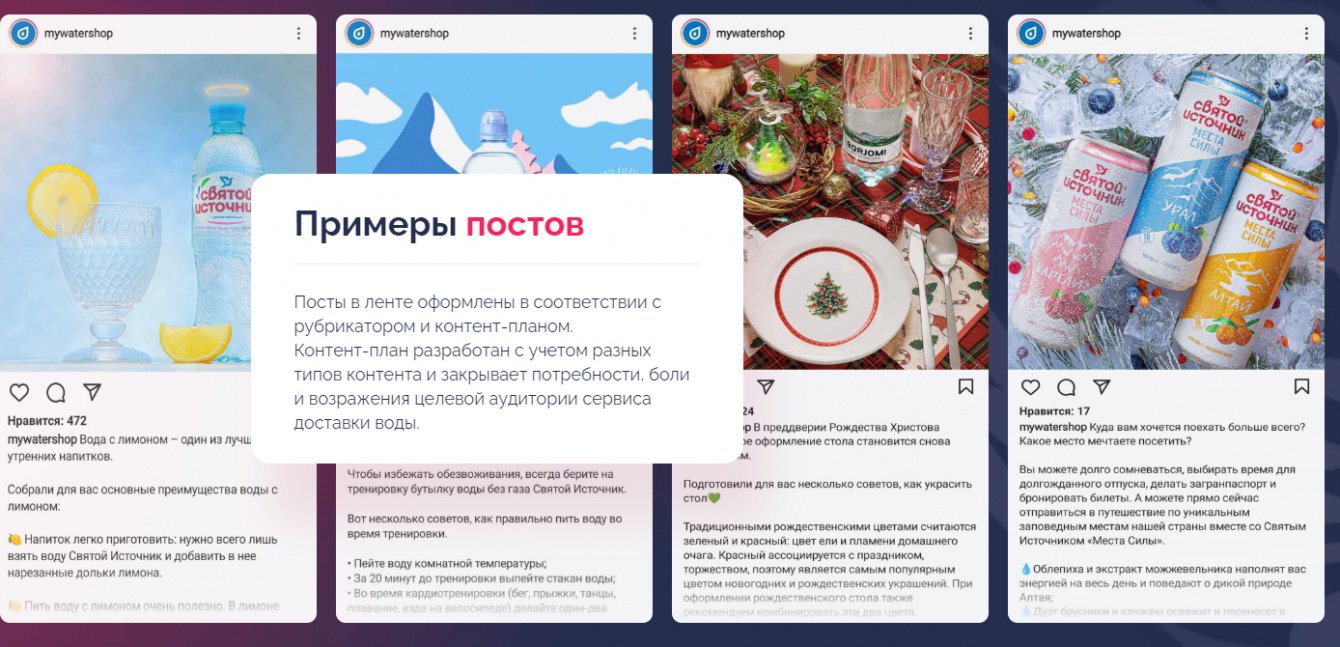 Посты в ленте оформлены в соответствии с рубрикатором и контент-планом.Контент-план разработан с учетом разных типов контента и закрывает потребности, боли и возражения целевой аудитории сервиса доставки воды.