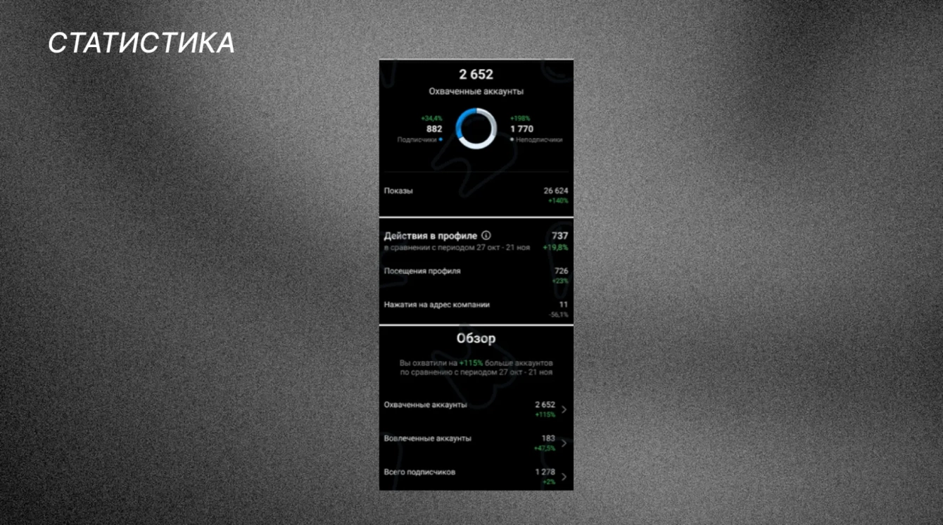 Показатель взаимодействия с контентом также увеличился, что говорит о том, что все посты стали получать больше отклика. Соответственно, нашей команде удалось грамотно проработать смысловую часть контента, а также захватить внимание продакшеном и постобработкой отснятого материала.