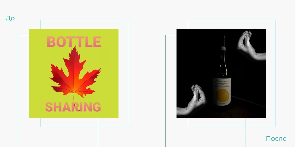 У нашего заказчика не было единого стиля в оформлении ленты: использовалось много плакатов, мало фотографий и живого контента. Композиционные решения не применялись — крупные планы соседствовали друг с другом, часто повторялись однотипные снимки. Использовали разные шрифты. Картинки не передавали позиционирование и имидж, по последним постам казалась, что бар только проводит дегустации и другие мероприятия.