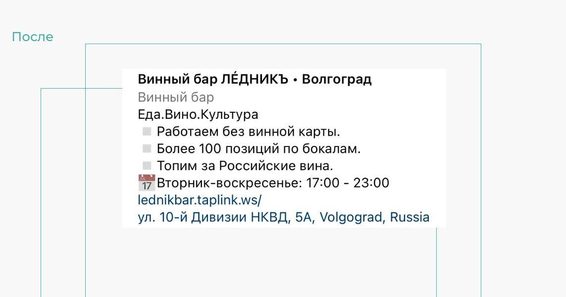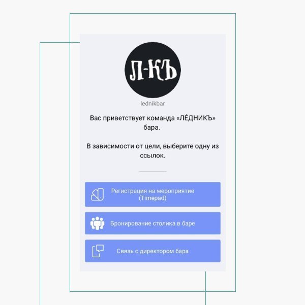 В описании профиля была возможность добавить только одну ссылку на сайт. Так как в баре постоянно проводились мероприятия, на которые продавались билеты через TimePad, нам приходилось убирать сайт и ставить ссылку на мероприятие. В такие моменты у подписчиков пропадала возможность забронировать столик. В силу того, что основная целевая аудитория взрослая, решили собрать самый простой Taplink с тремя кнопками: регистрация на мероприятие, бронирование столика и связь с баром.